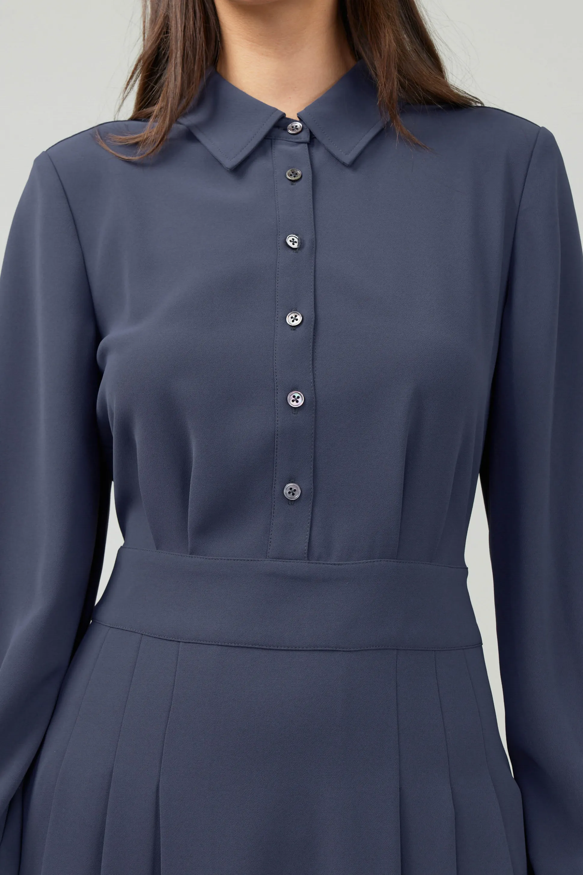 The mini dress you’ll keep coming back to all season long. This navy button-up style features long sleeves and a pleated skirt that moves with ease.
