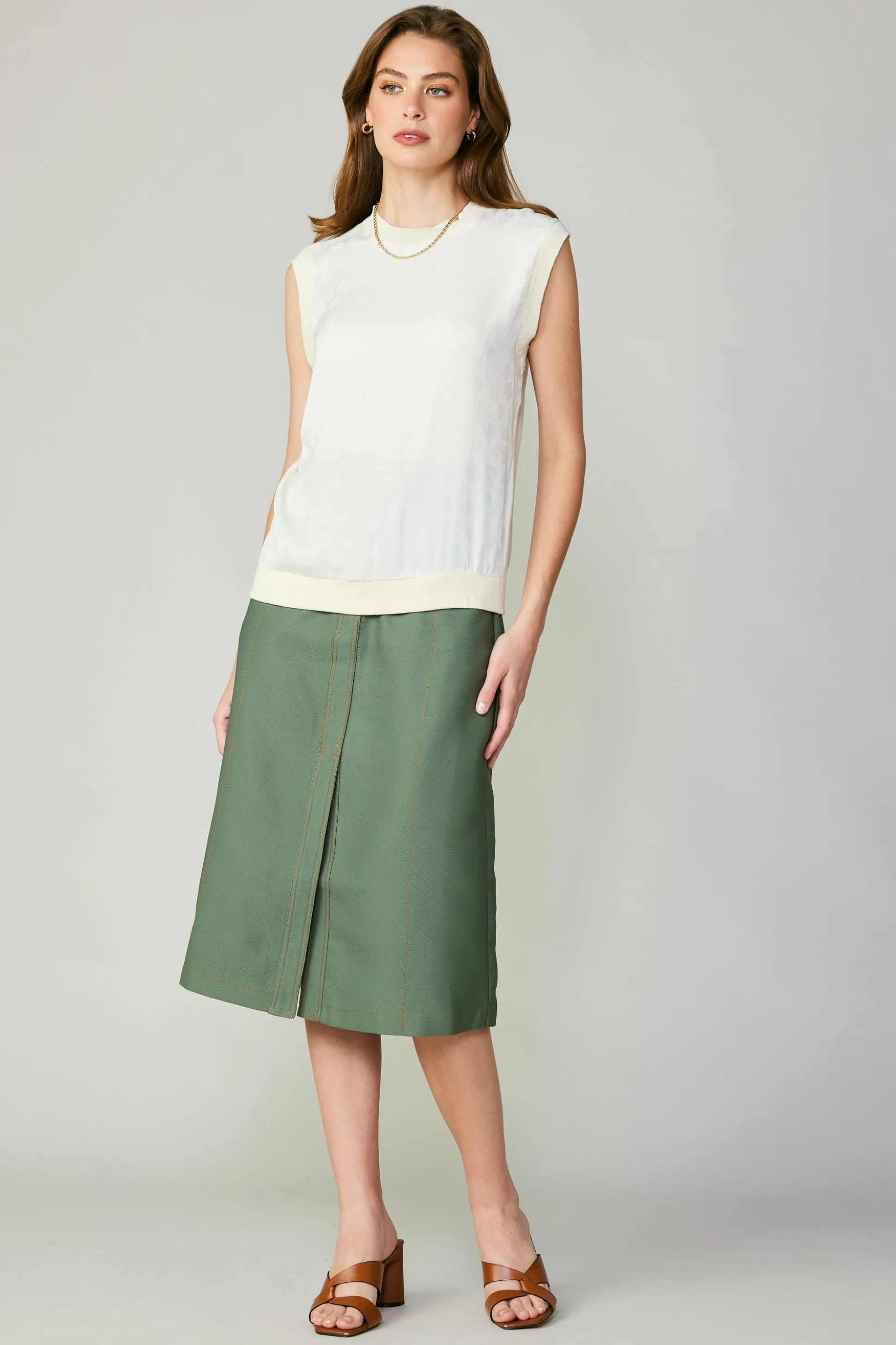 This knit top is perfect for warmer days with an airy, relaxed fit. It features a subtle jacquard front with contrast knit back.Designed in a sleeveless silhouette, it has a crew neckline and ribbed edges.