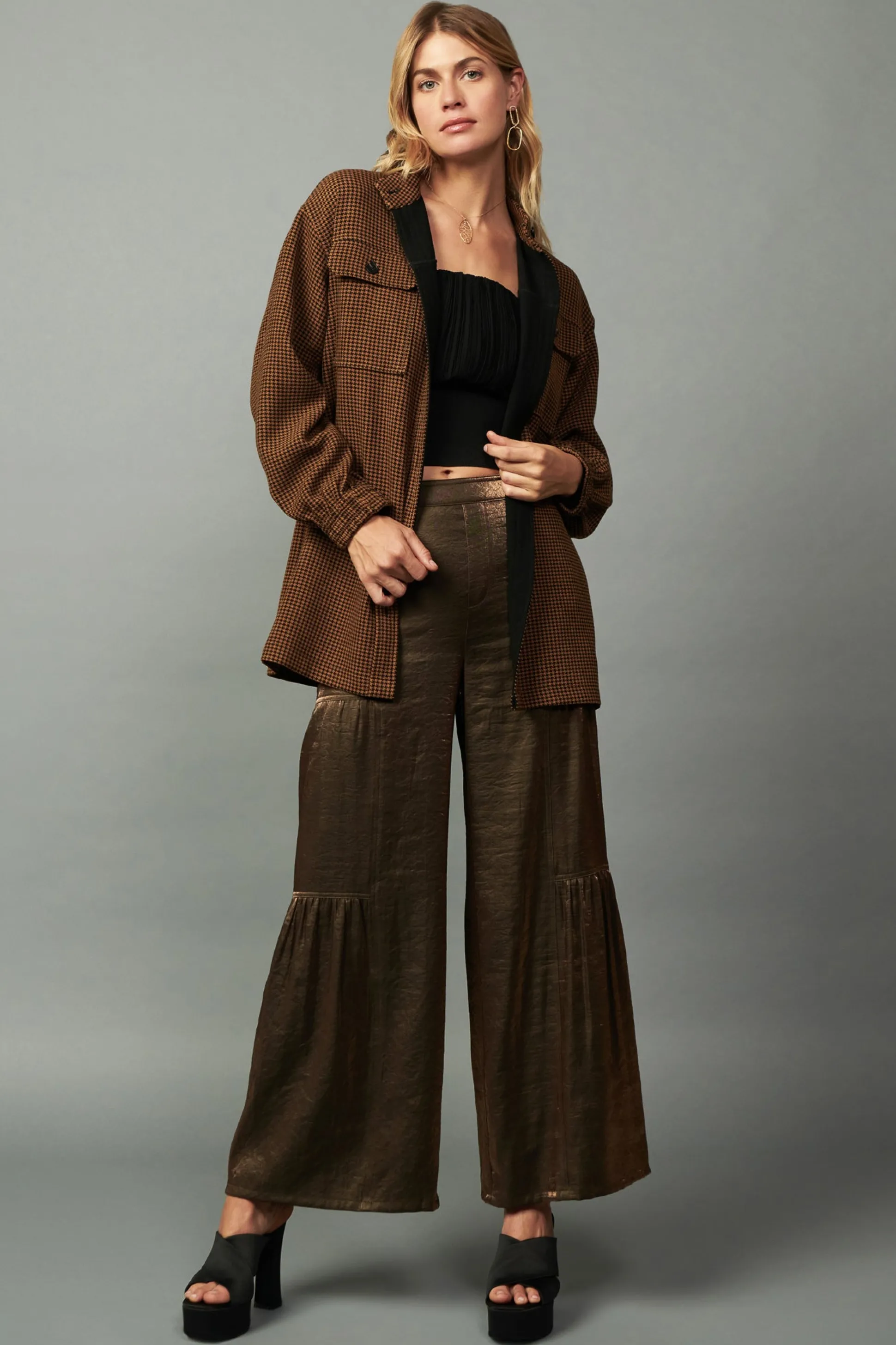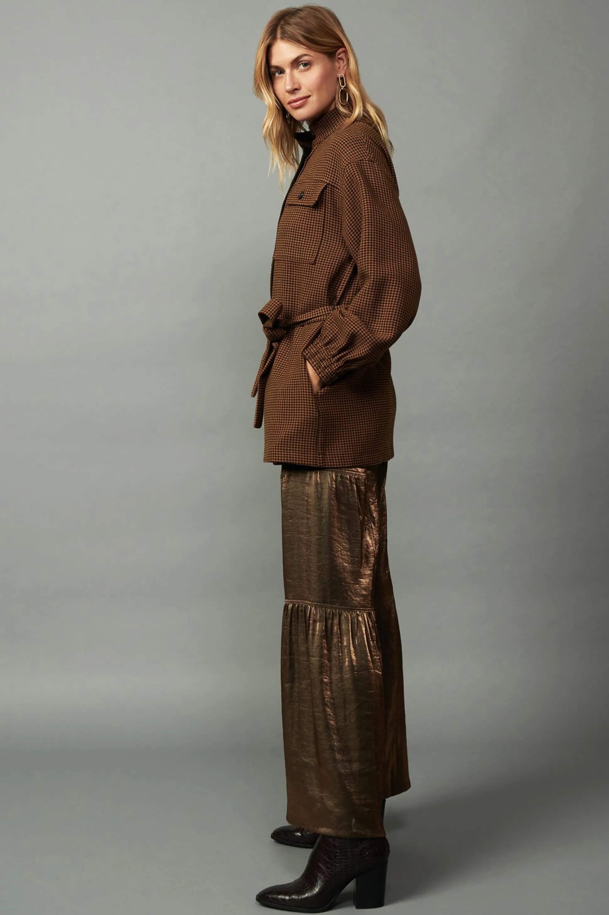 Cut for an oversized fit, this houndstooth jacket is a cool layer to throw on as the temperature dips. A stand collar, flap pockets, and long sleeves with elasticized cuffs add character to the slouchy silhouette. Leave it undone for a laid-back look, or button it all the way up to keep the chill at bay.
