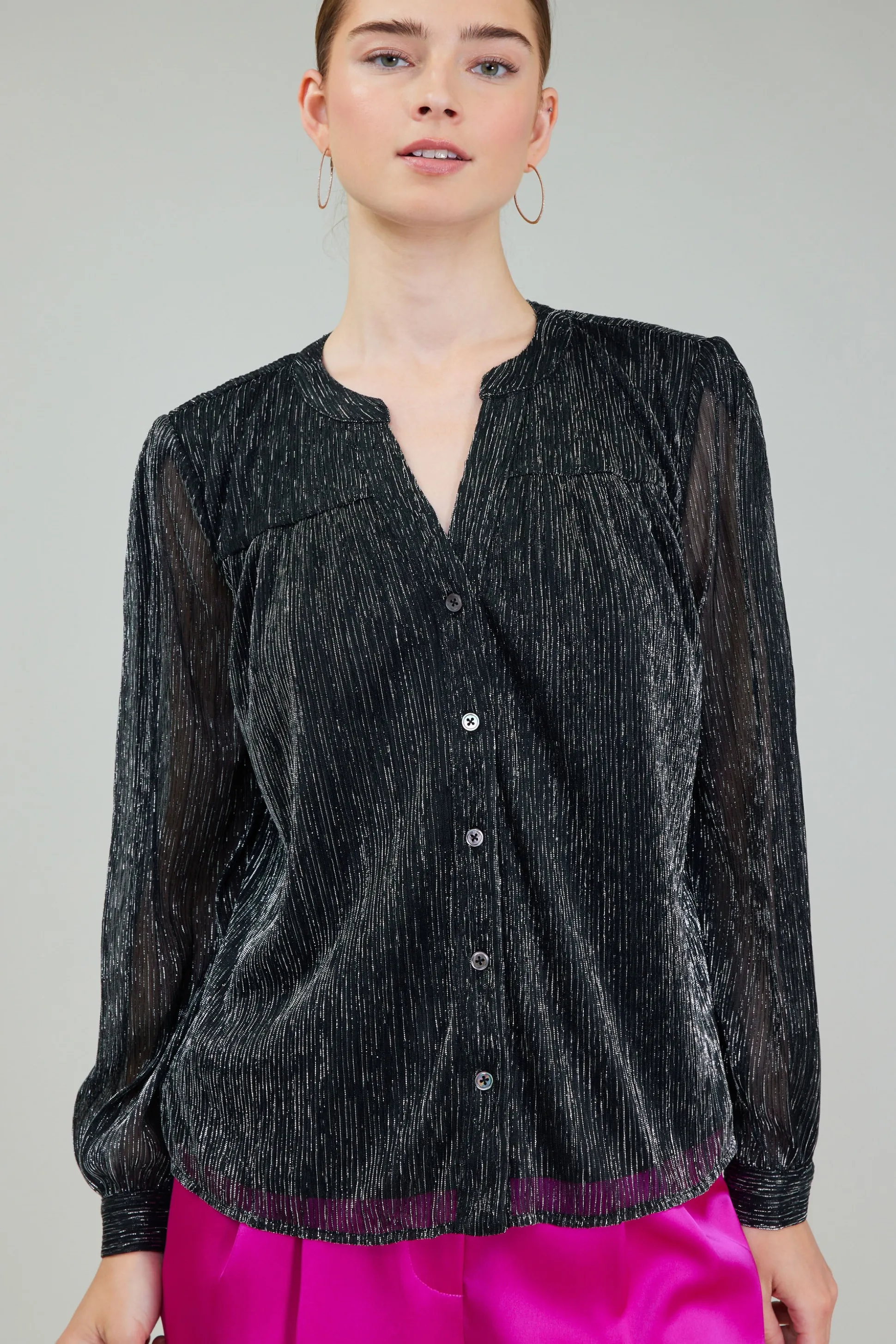 Gleaming metallic silver threads are woven into this subtly sheer black top. Cut for a relaxed shape, this long-sleeve style has a split neckline, band collar, and buttons down the front. Delicate gathers detail the back to enhance the easy drape.