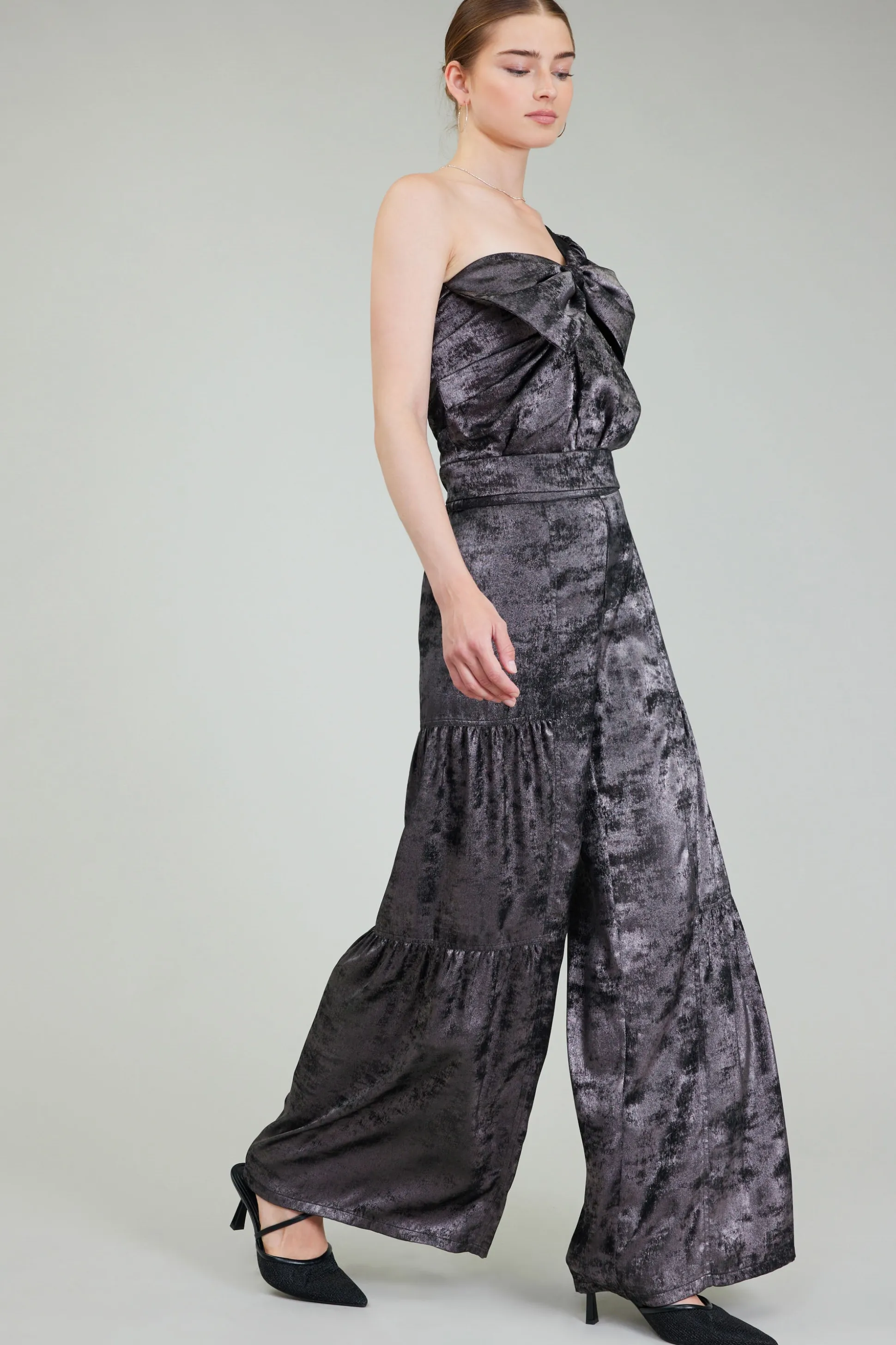 The ultimate party top. Featuring a giant bow at the front, it’s got a lustrous sheen and a single long sleeve. The bodice is pleated, gathered, and smocked at the back, complete with a banded waist.