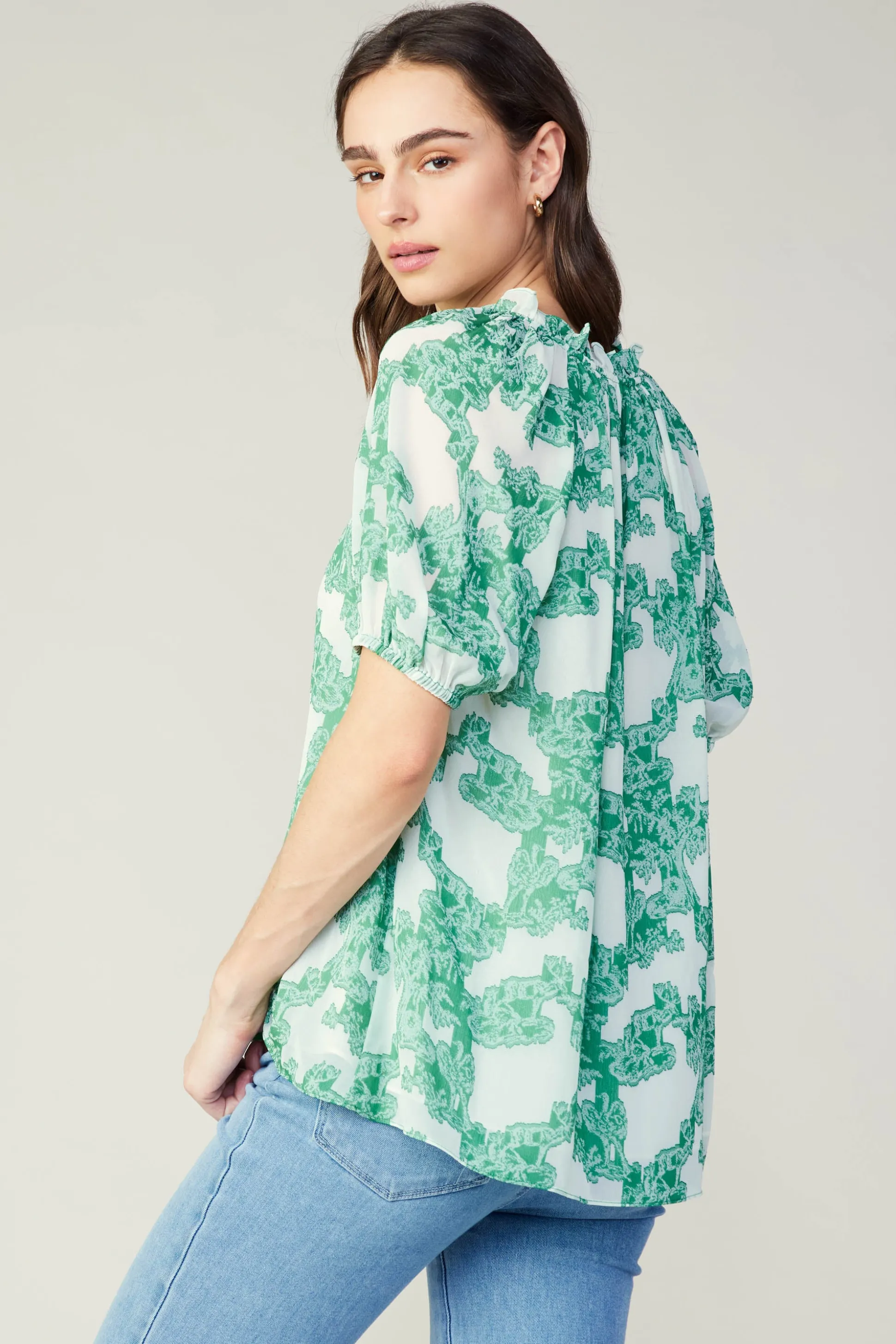 Print worthy. Patterned with an abstract nature scene, this split-neck blouse comes in a loose, easy silhouette featuring ruffle trim and short sleeves.