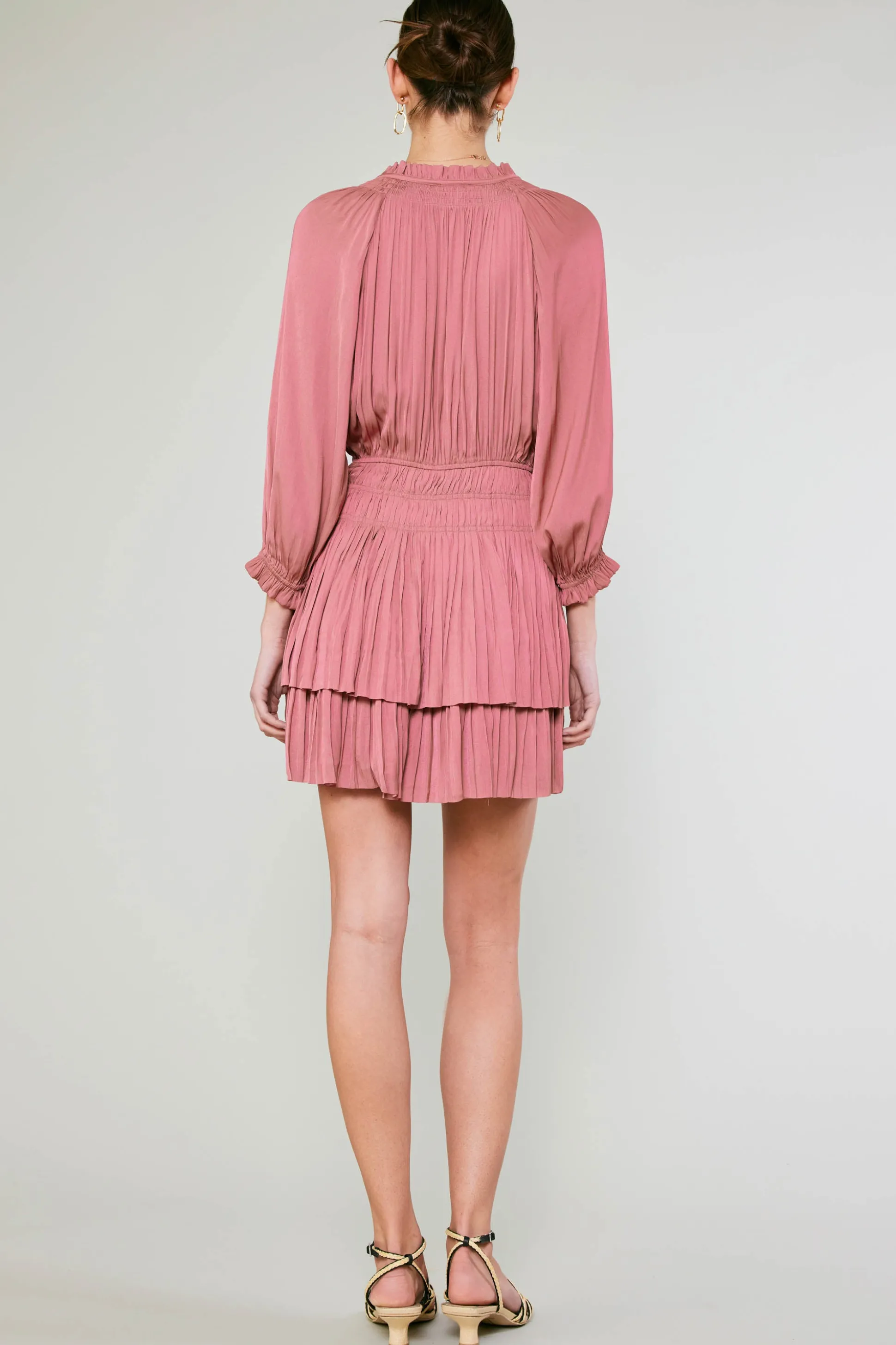 All hail the little pleated dress. It’s chic yet absolutely effortless, done here with three-quarter sleeves and elevated by a tie neck, ruffle trim, and a shape-enhancing elastic waist that leads to a fluttery tiered hem. Pair it with heels for nighttime or with flats during the day.
