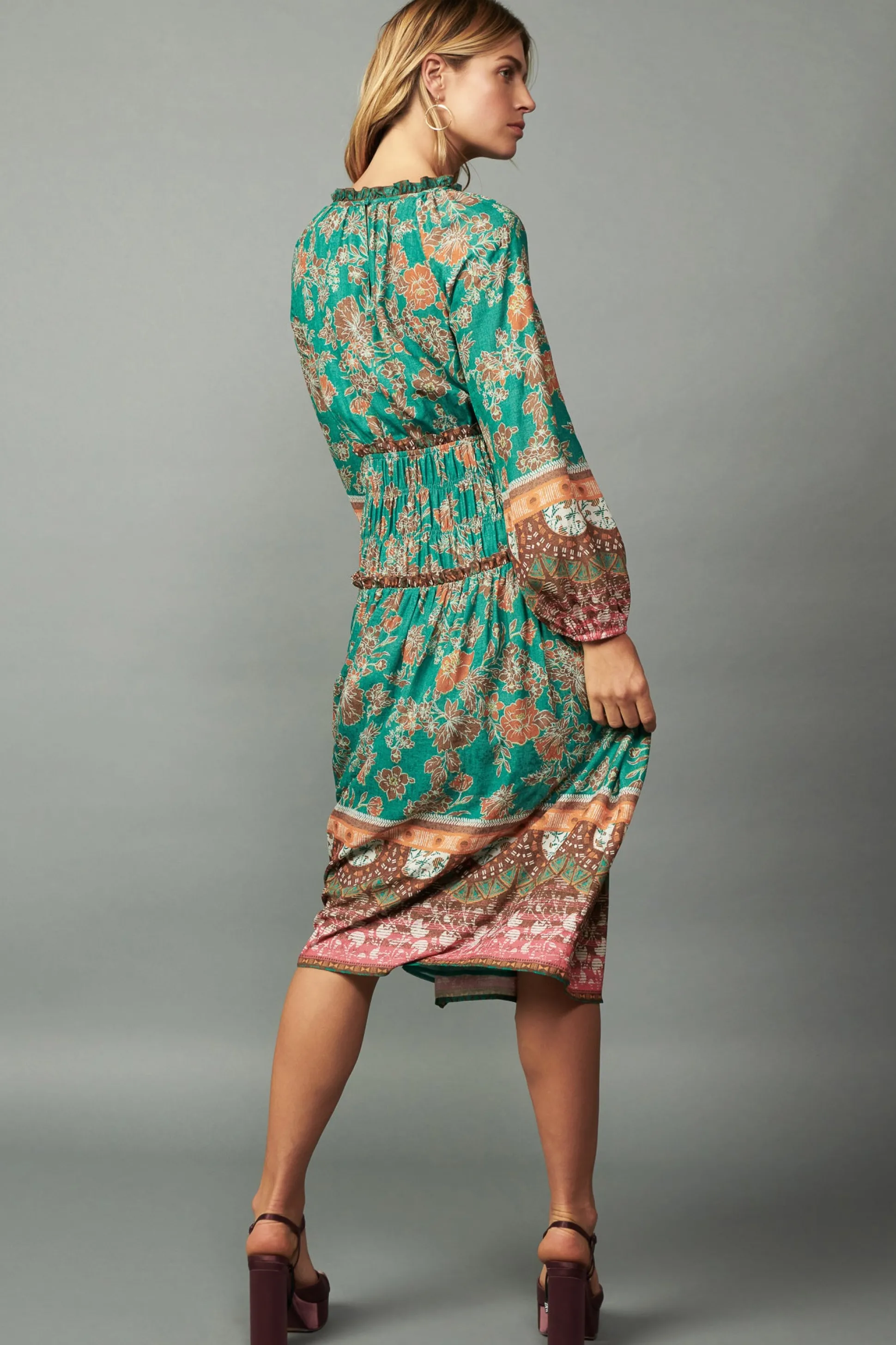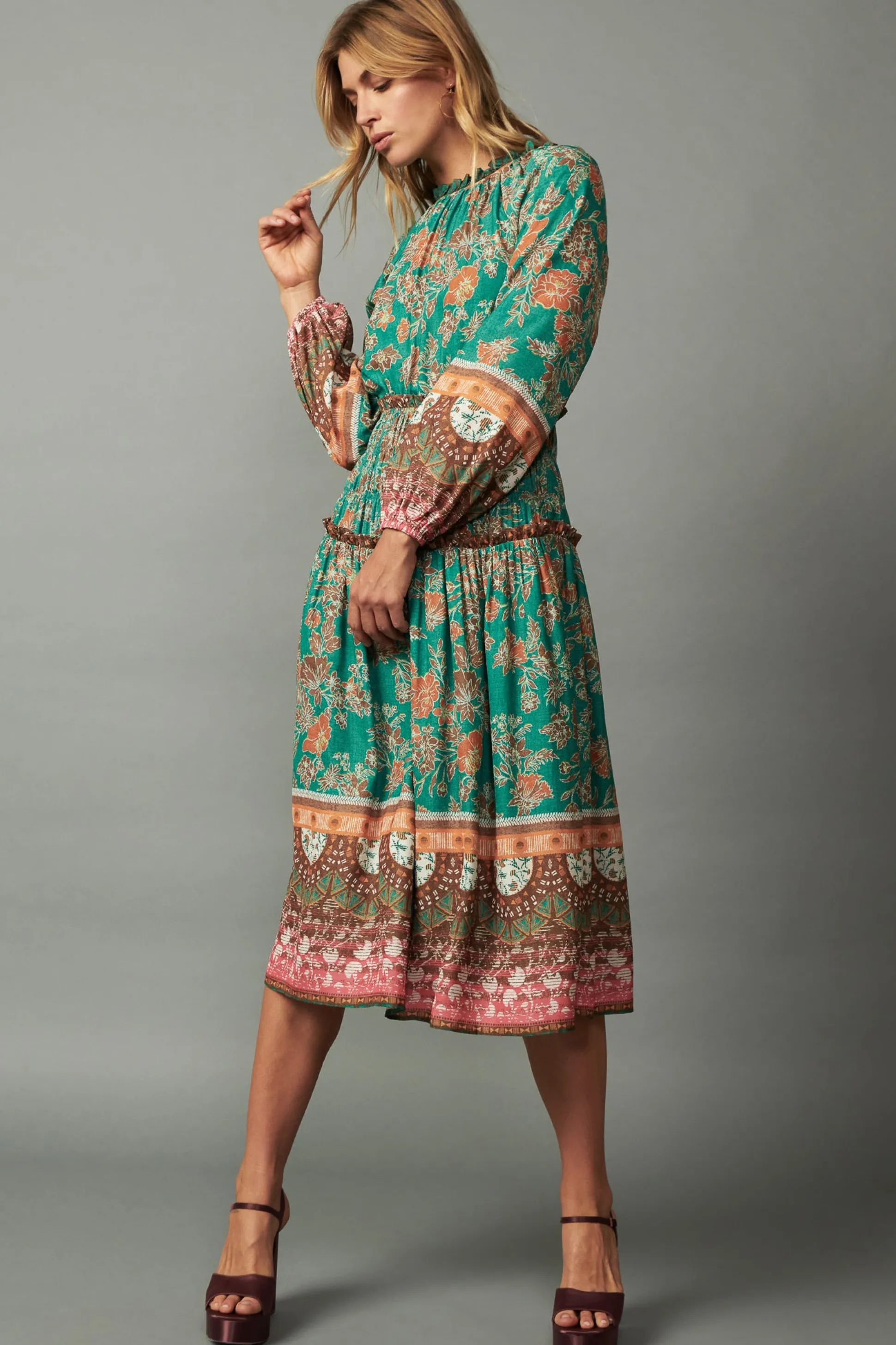 With its colorful print, feminine details, and swingy shape, this midi-dress is quite the charmer. It’s got a relaxed fit and puffed sleeves up top, tempered by a smocked waist before falling to a shin-skimming hem. We also added in some ruffles for good measure. Go ahead and start planning where you’ll go in this one.