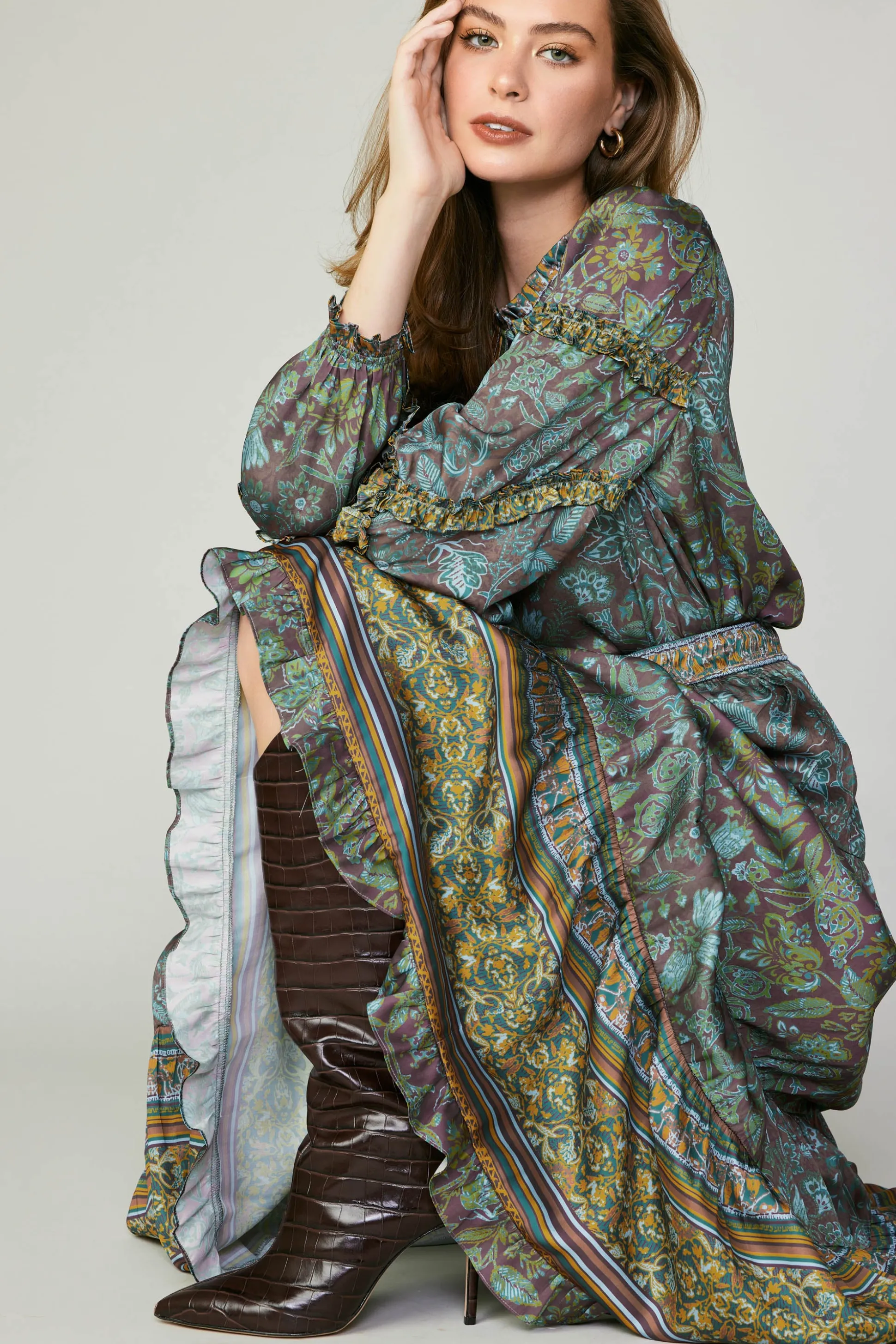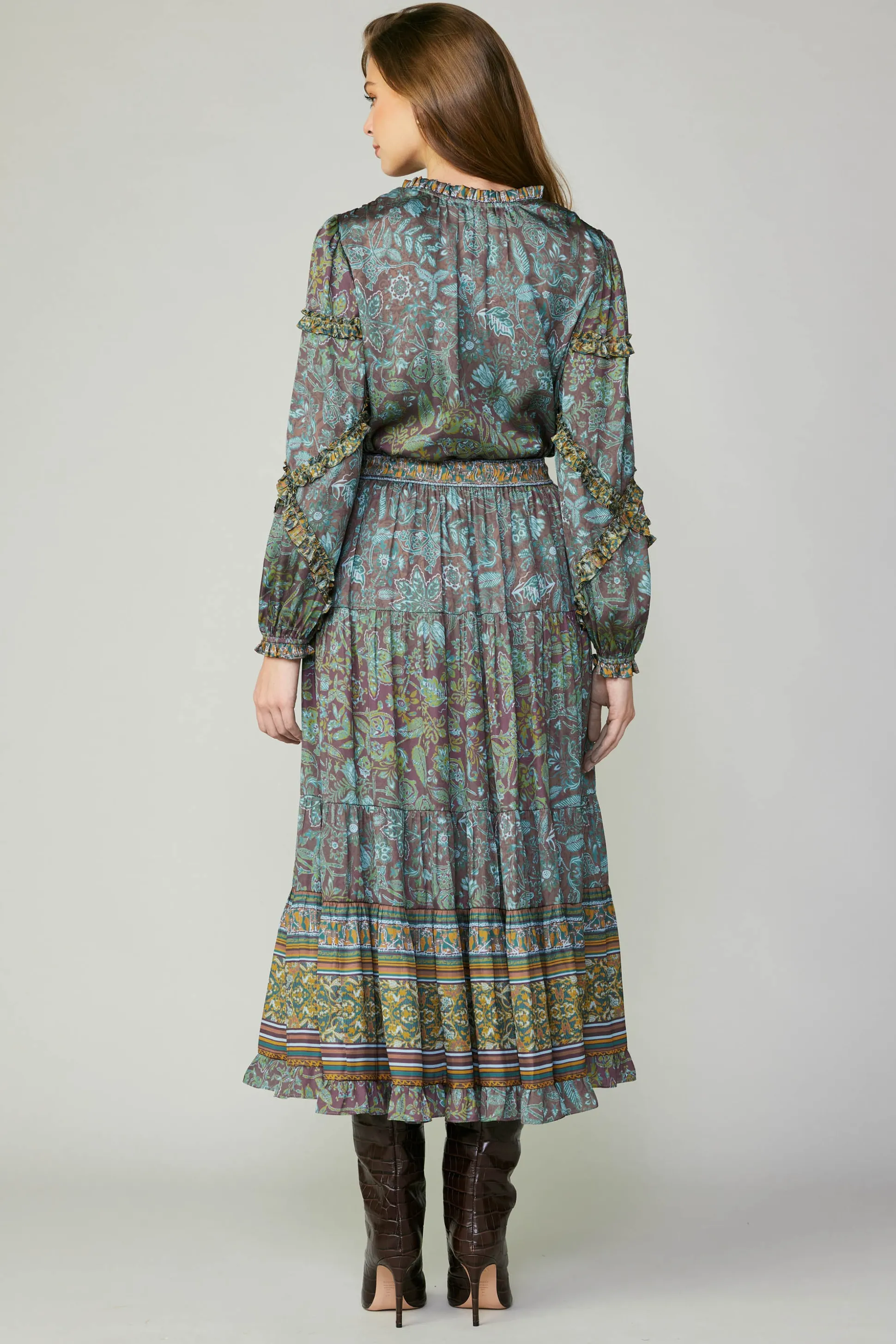 This swingy tiered skirt has a charming floral print accented by a striped border. It’s anchored by a comfortable elasticized waist and falls to a ruffled hem.