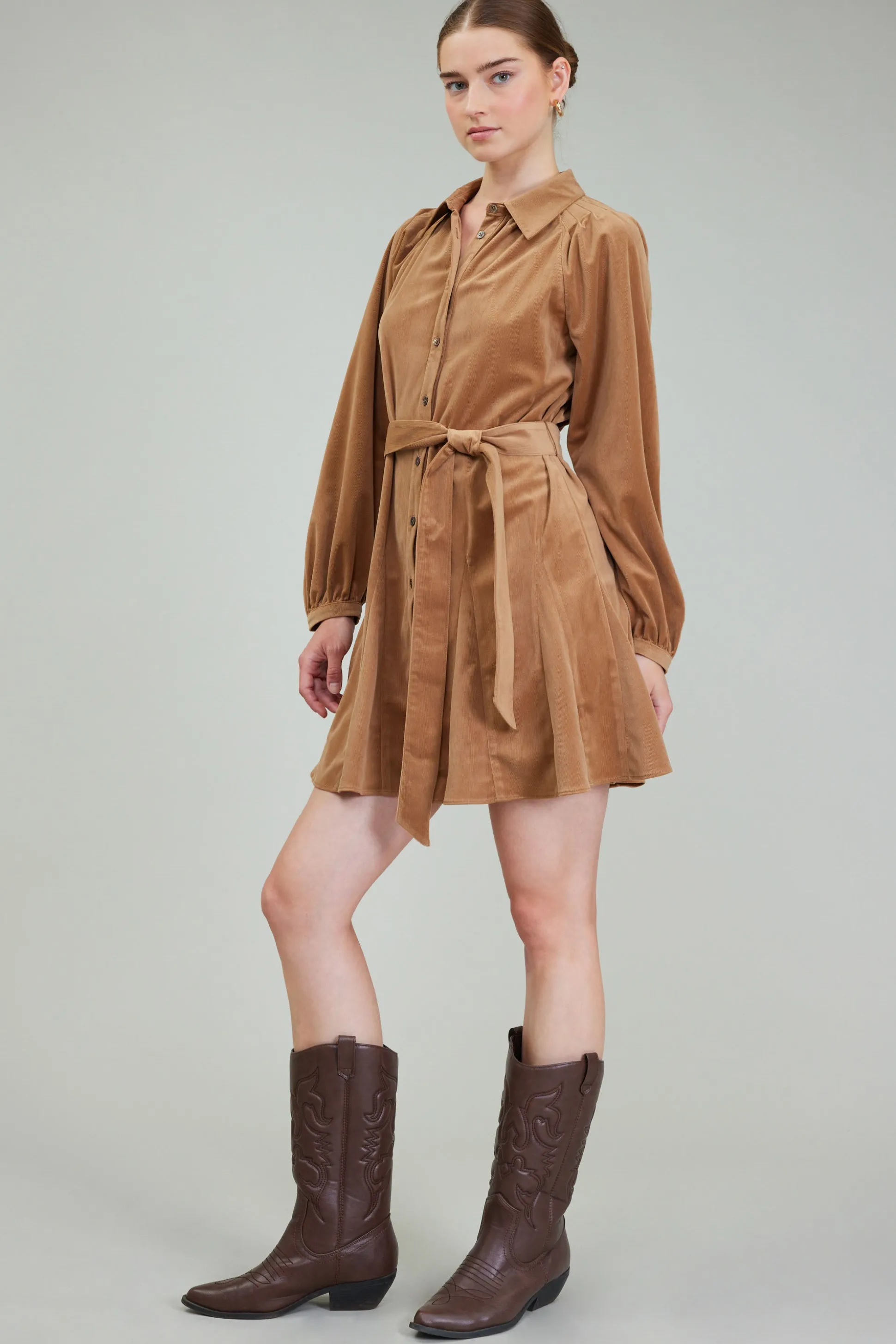 This long-sleeve mini dress couldn’t be more charming. The pointed collar and concealed button placket are classic elements, but the details make it special. It’s got pleated shoulders and a wide tie belt, plus a flared skirt with godet detailing to create a voluminous shape.