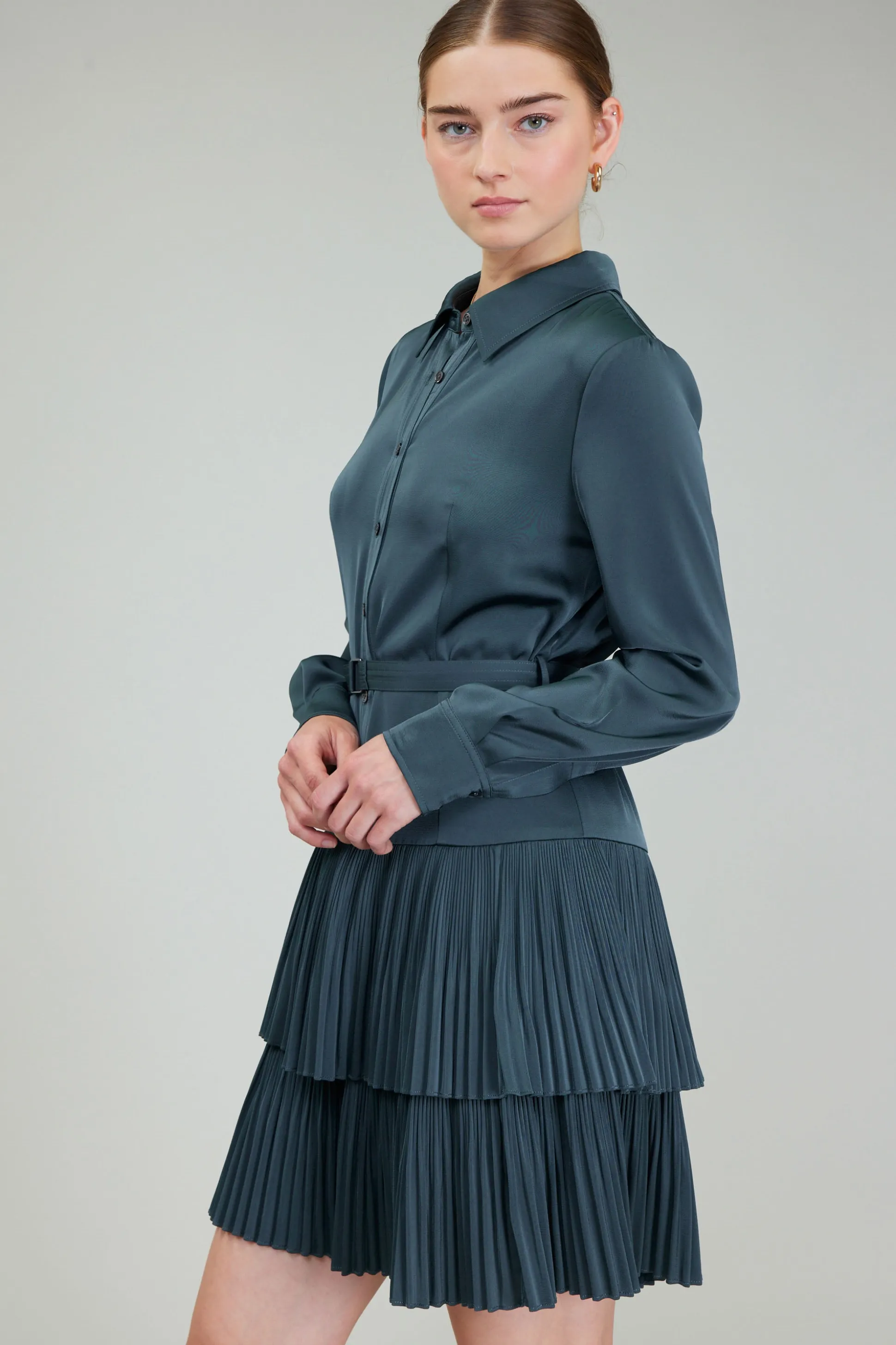 Can’t go wrong with this deep shade of green, this high-neck shirt dress demands a closer look. Precise pleats create texture and structure at the tiers of the skirt.