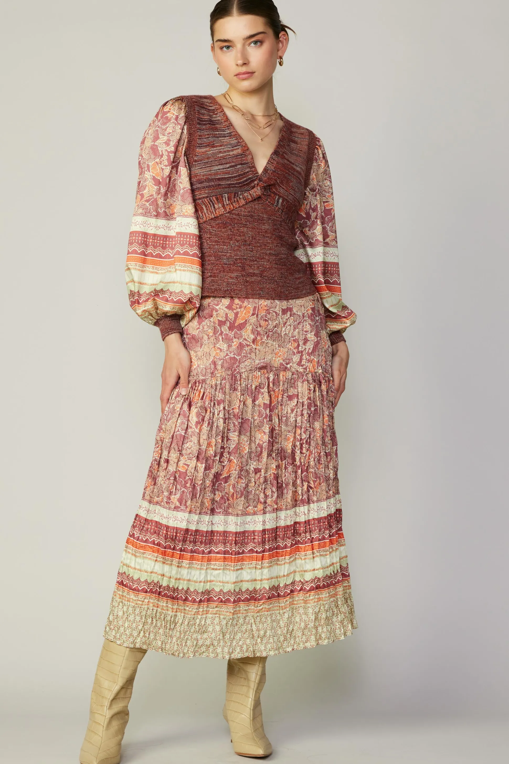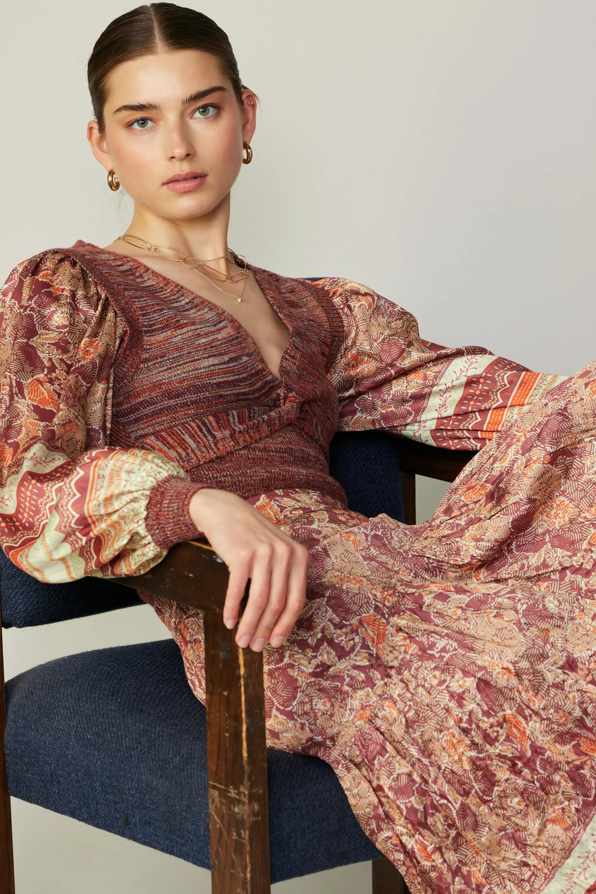 A spacedye V-neck sweater with a twist. It’s got a plunging neckline and twisted detailing at the front, plus woven blouson sleeves in an ornate print.