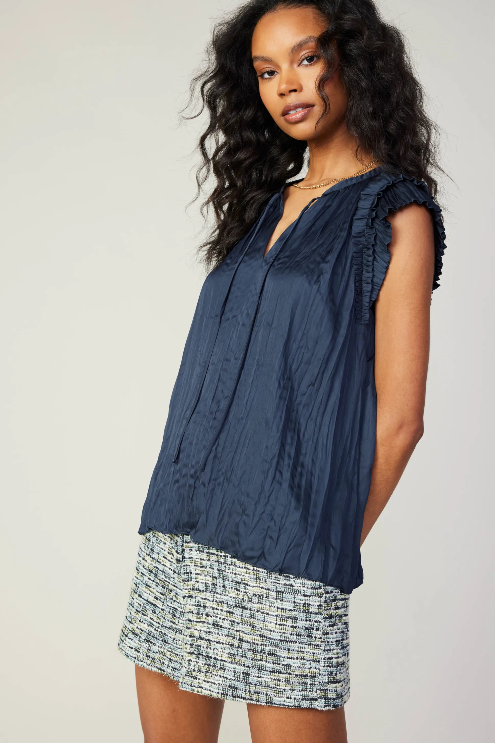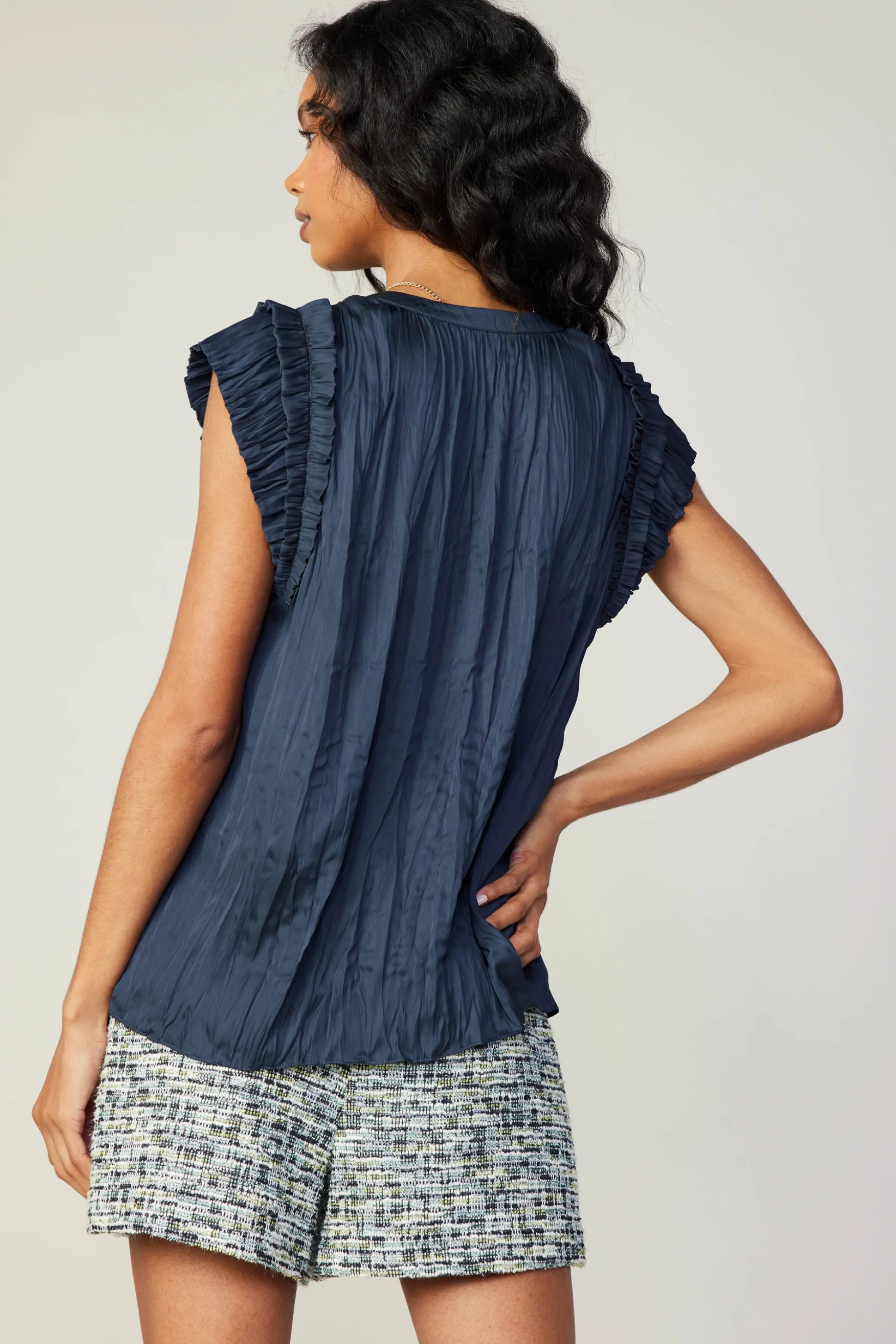 Softly crinkled pleats give this split-neck top an artful touch of texture. With a graceful drape and ruffles, the cap-sleeve style moves beautifully.