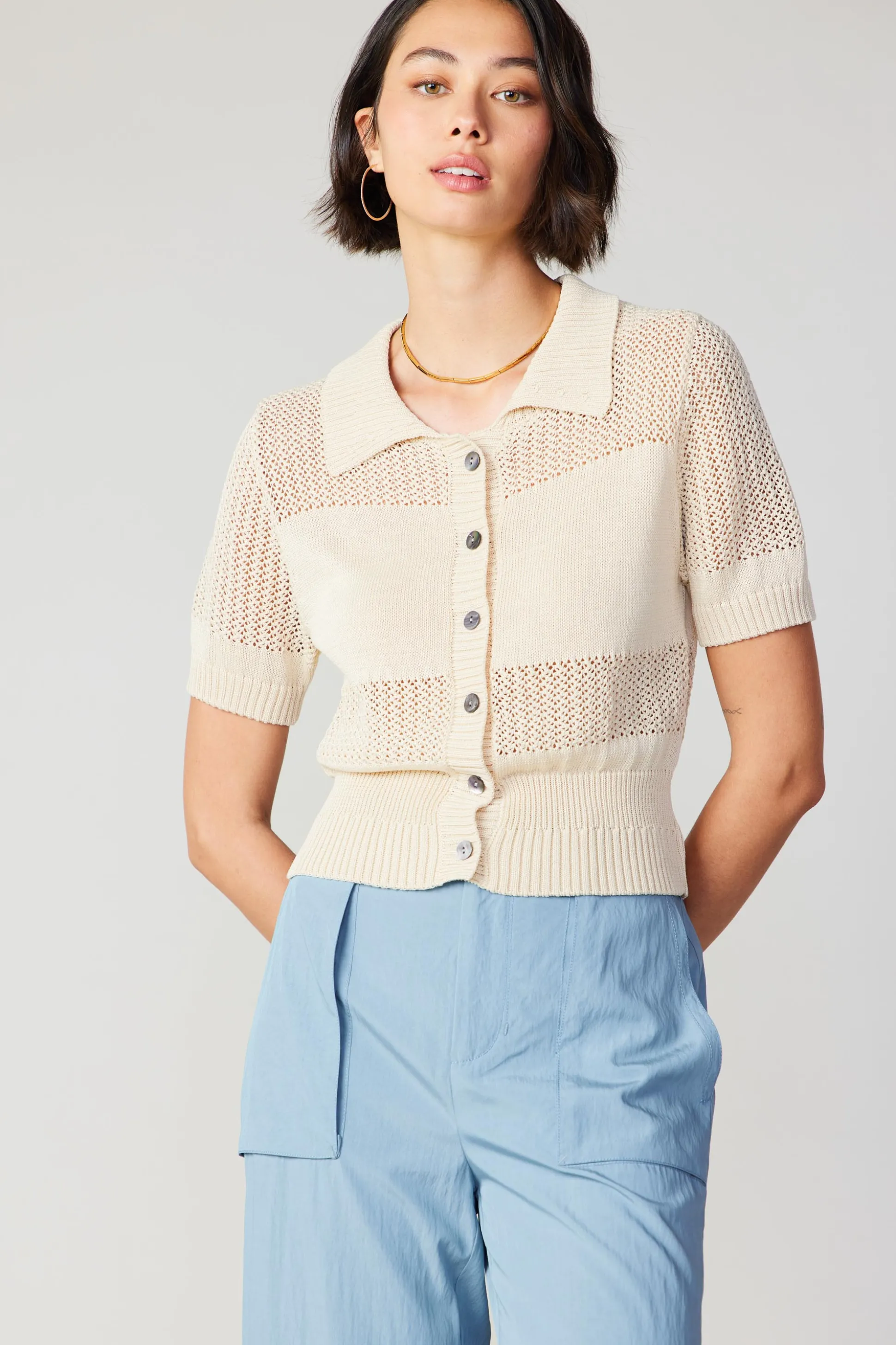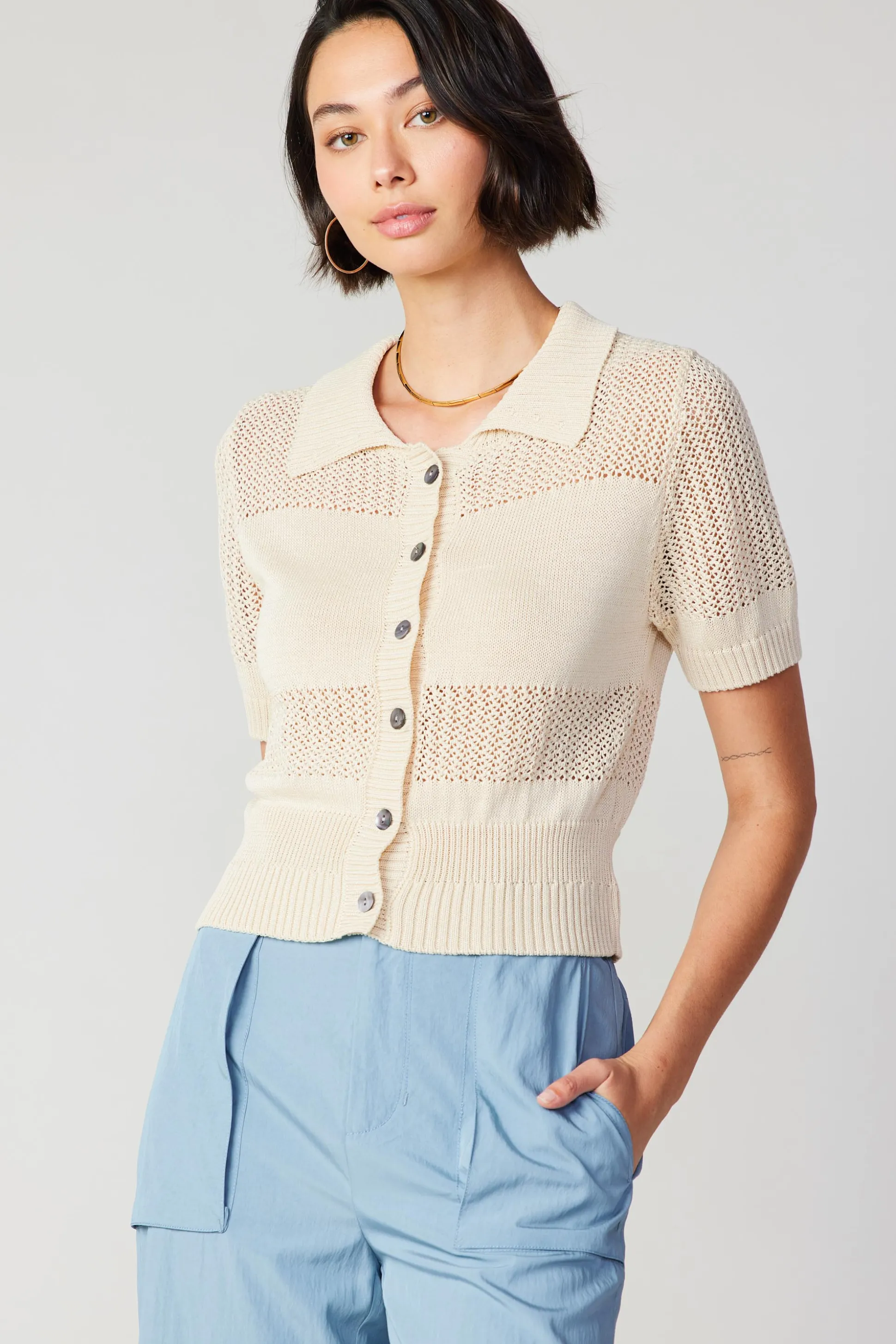 Short sleeves and an airy open knit make this cropped cardigan a go-to for warm-weather layering. Wear it over a simple tank or underneath a lightweight jacket.