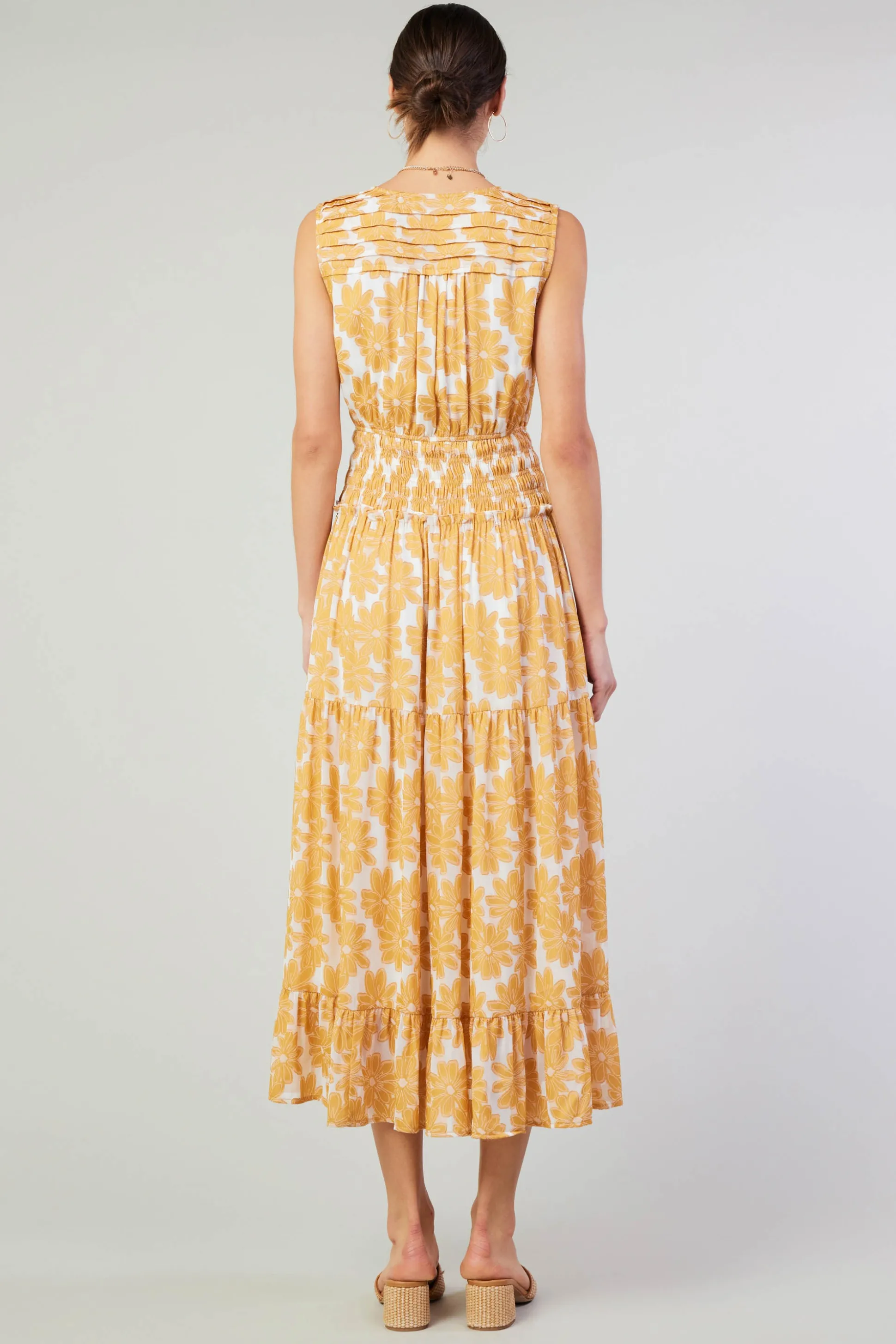 Take off with a new look for the season by slipping into this tiered midi dress. Printed with an abstract nature motif, it has a surplice-style bodice with fold detailing at the shoulders, comfortable smocking to draw in the waist, and a shin-skimming tiered skirt.
