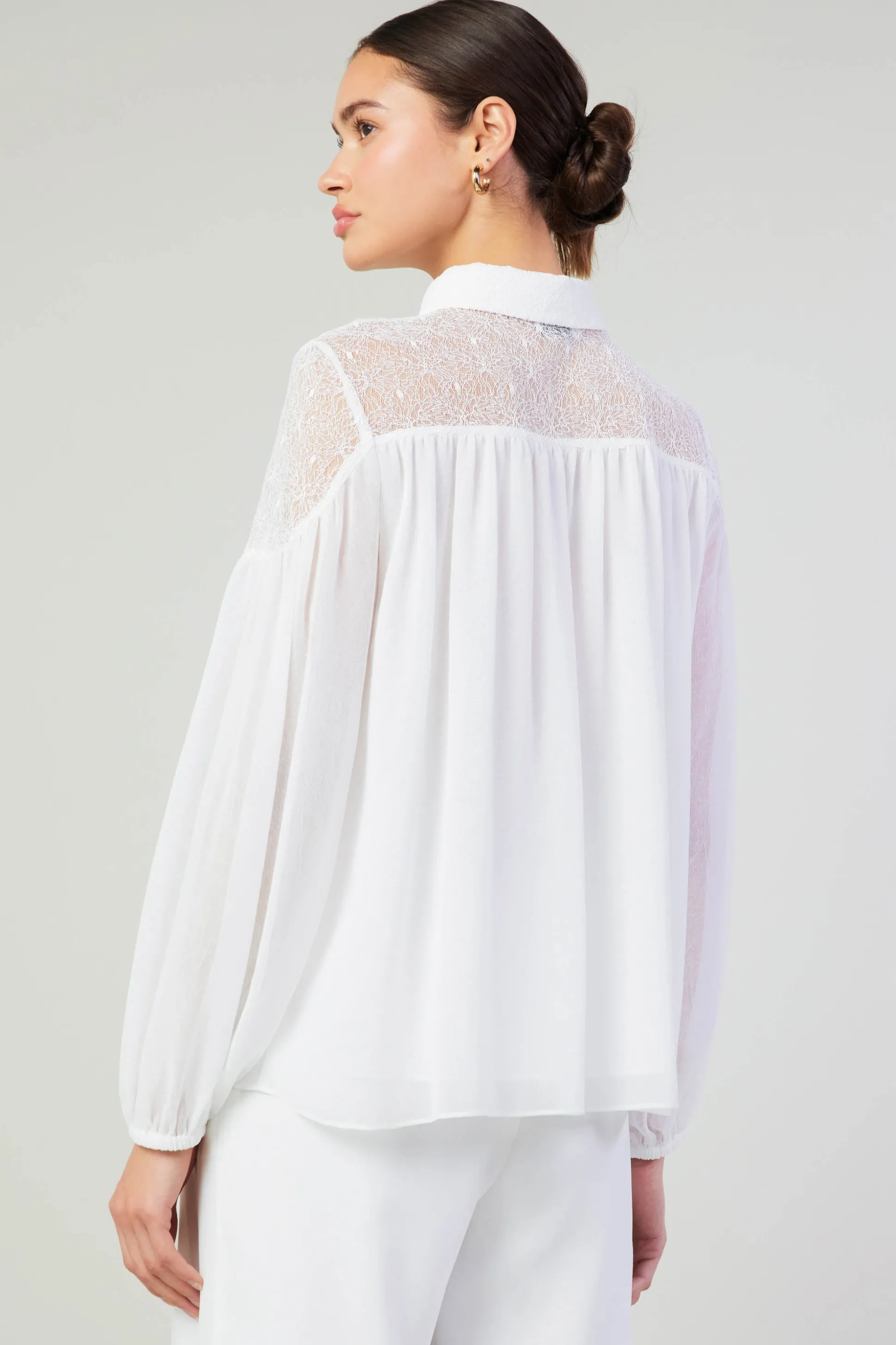 A lace paneled yoke accents this floaty blouse designed with a classic collar at the neck. It’s relaxed and airy, enhanced by subtle gathers that create a beautiful drape.