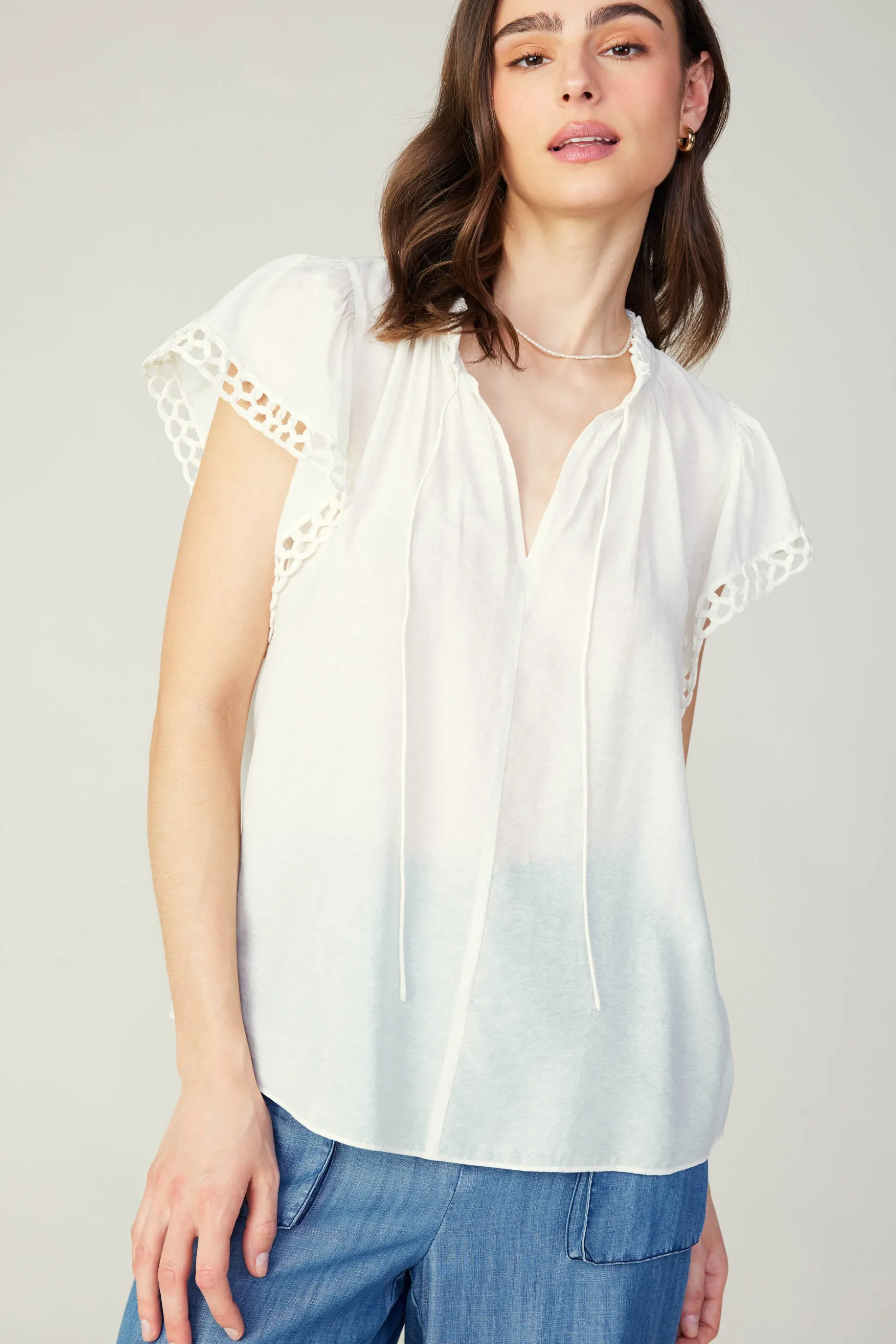 Ruffle accents, delicate ties, embroidered eyelet trim—the details add sweetness to this airy short-sleeve blouse. The fit is relaxed, enhanced by a split neckline and subtle gathers.