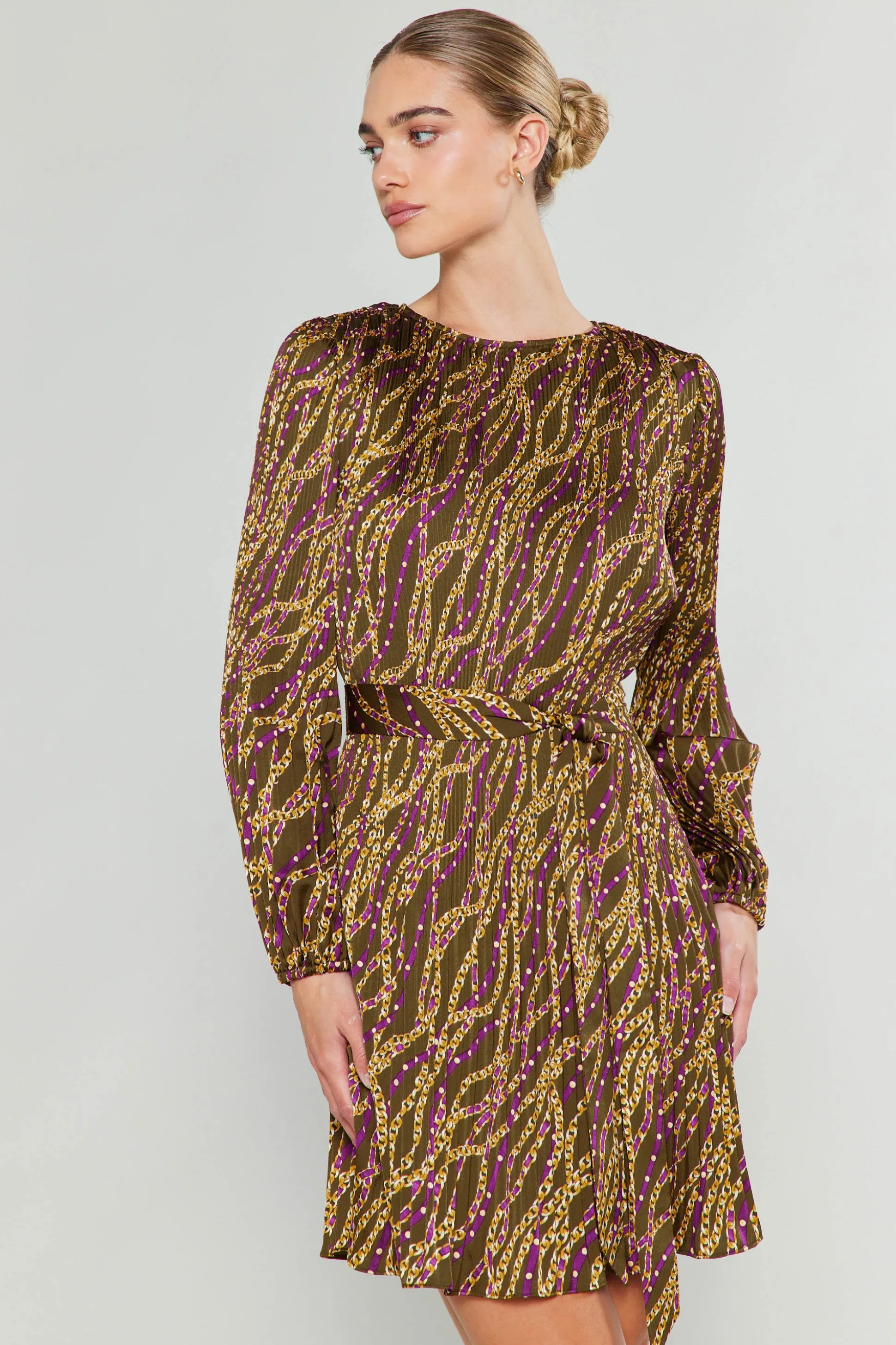 Light as a breeze, this golden link-print mini dress showcases blousy long sleeves, elasticized cuffs, and pleat detaili…
