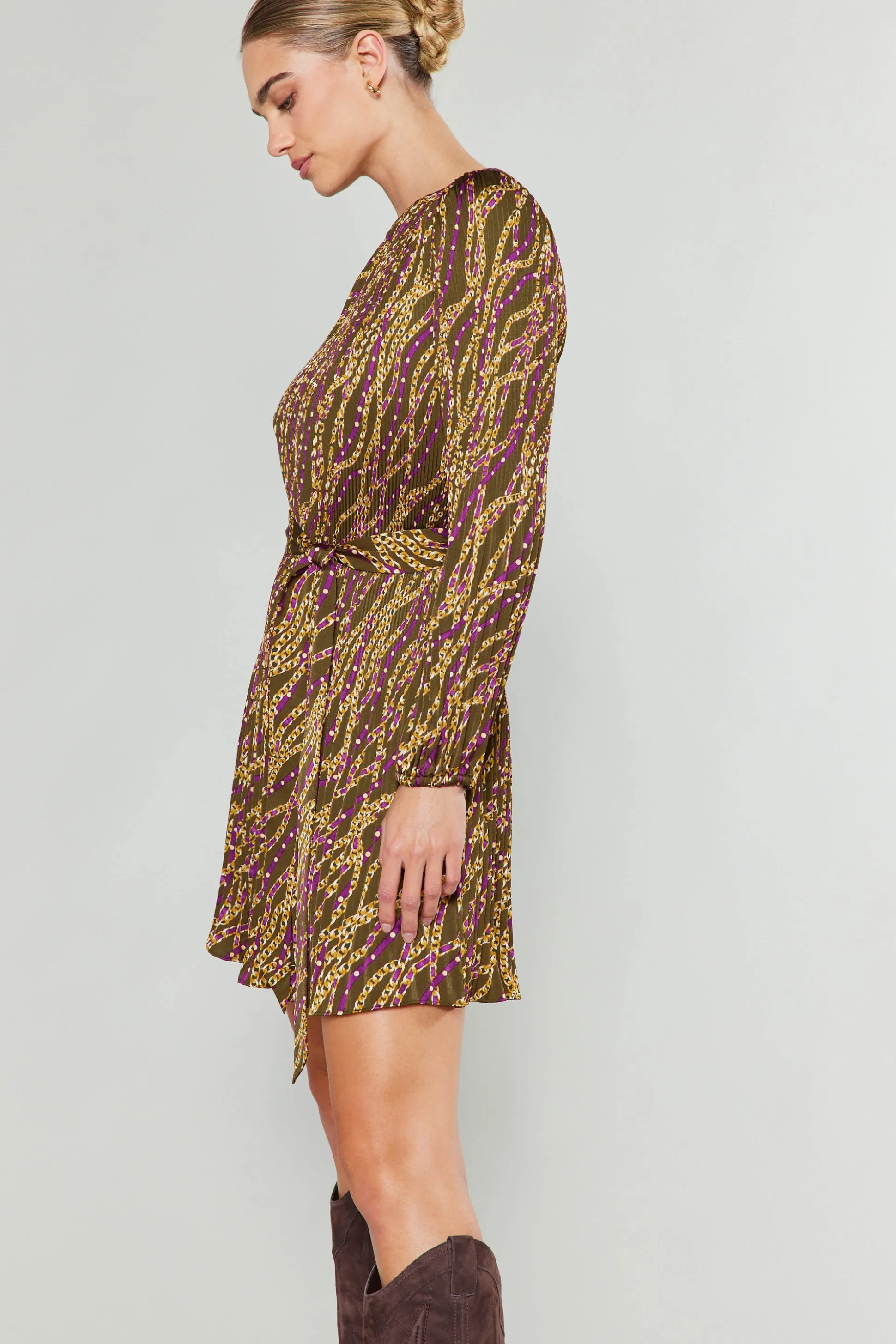 Light as a breeze, this golden link-print mini dress showcases blousy long sleeves, elasticized cuffs, and pleat detailing. A delicate self-tie at the neckline finishes the look.