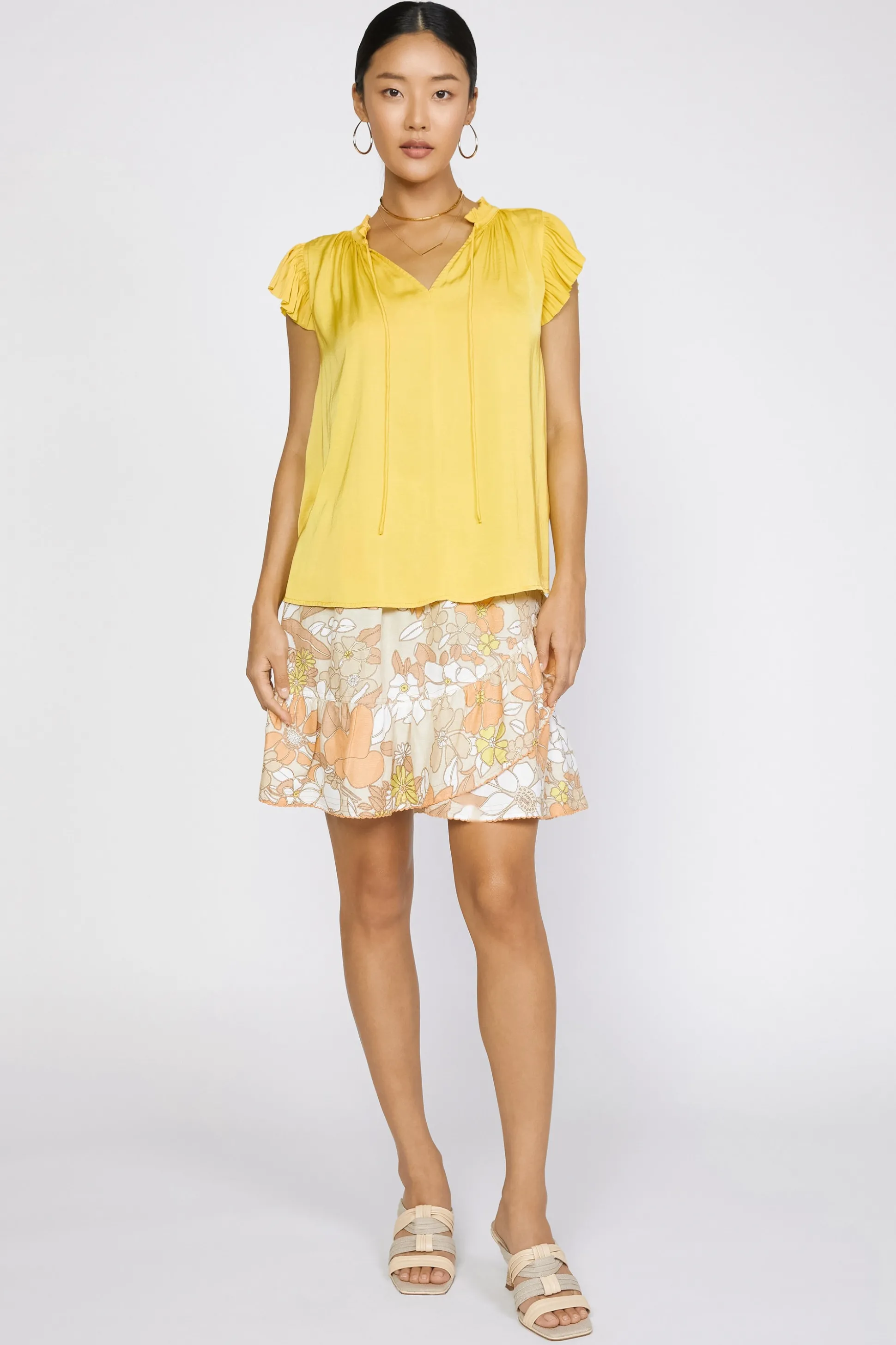 This pleated sleeve top is cut for a loose, easy fit and features a flattering split neckline with ruffle trim and tie detailing.A new favorite for your everyday wardrobe