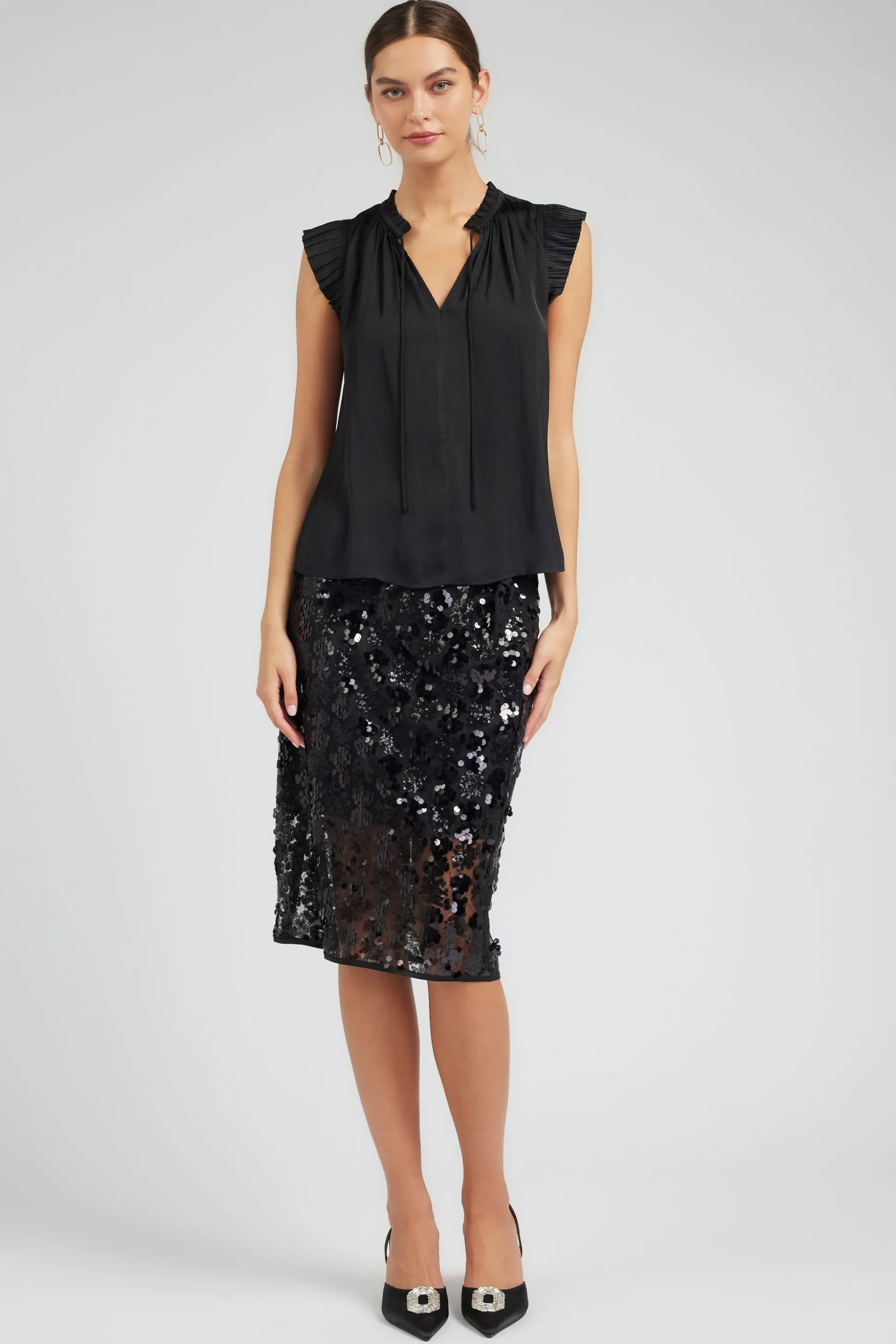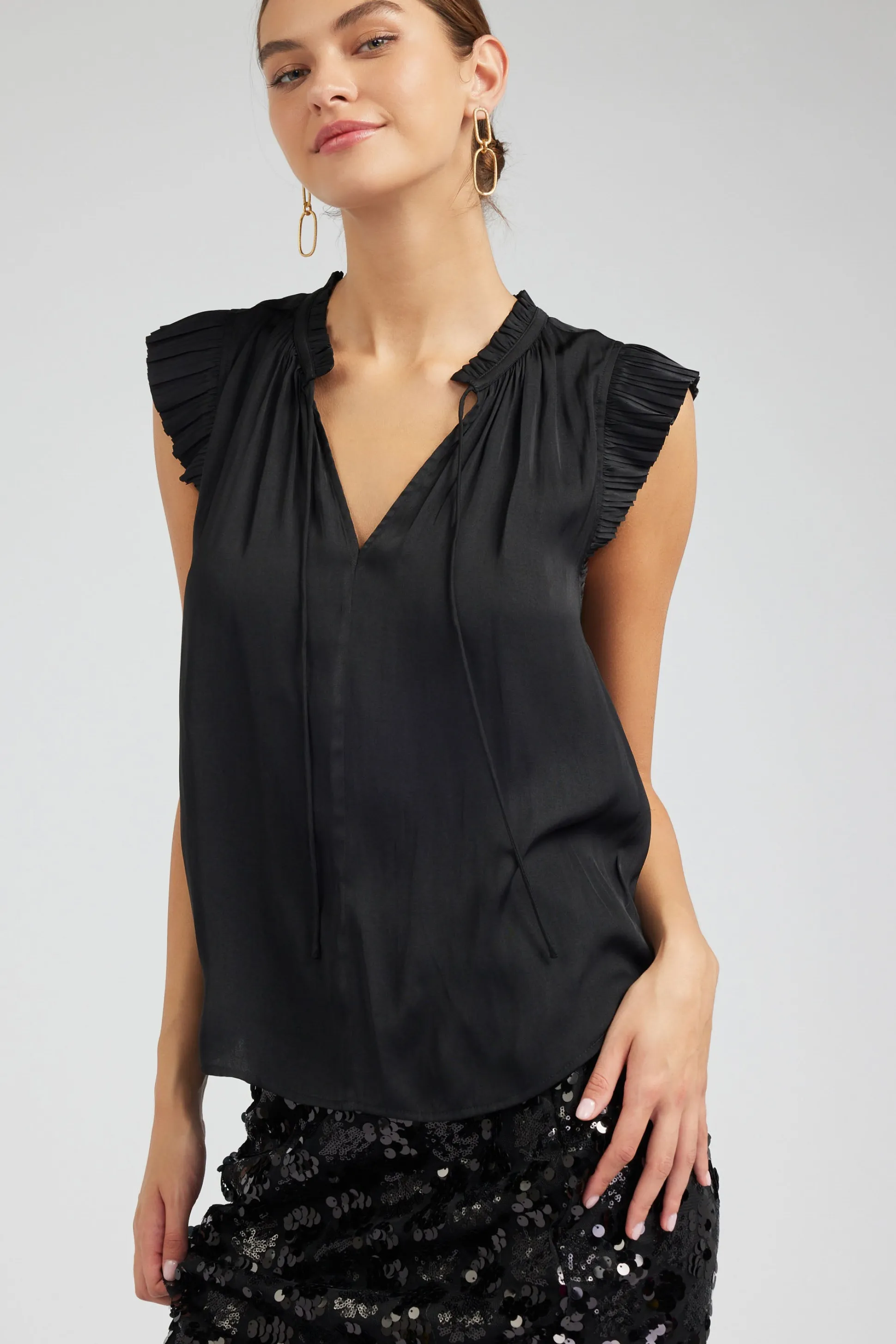 This pleated sleeve top is cut for a loose, easy fit and features a flattering split neckline with ruffle trim and tie …