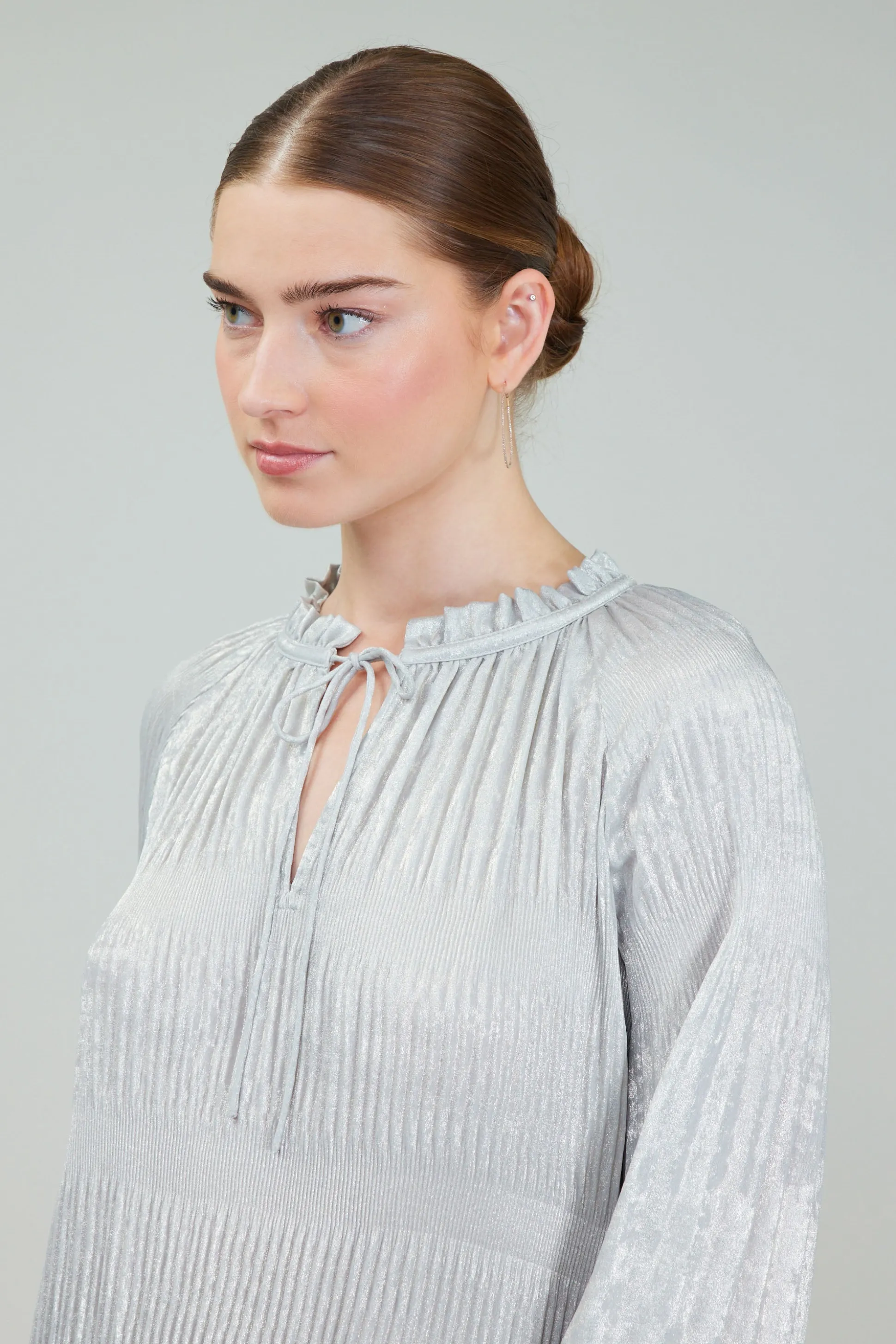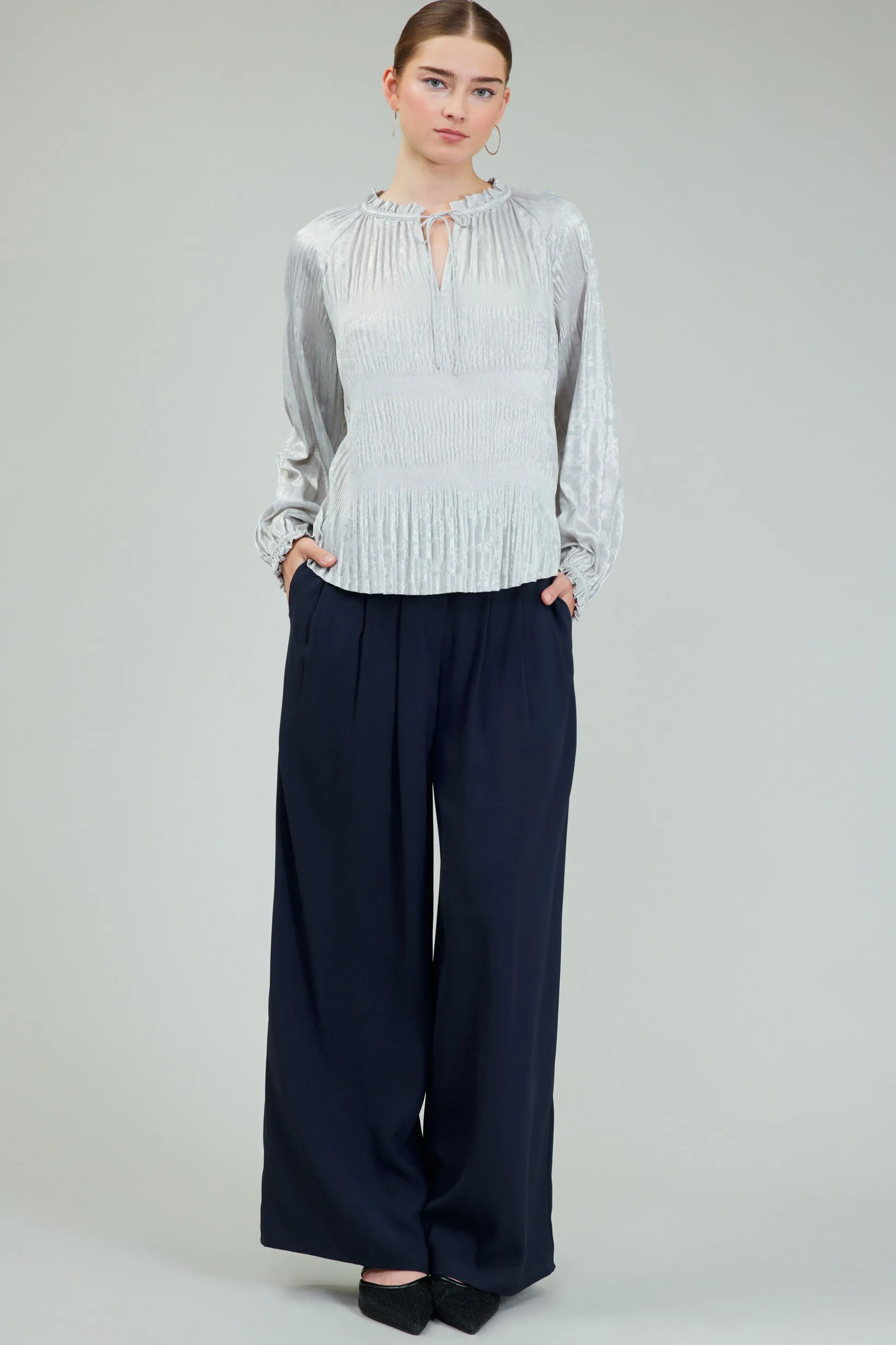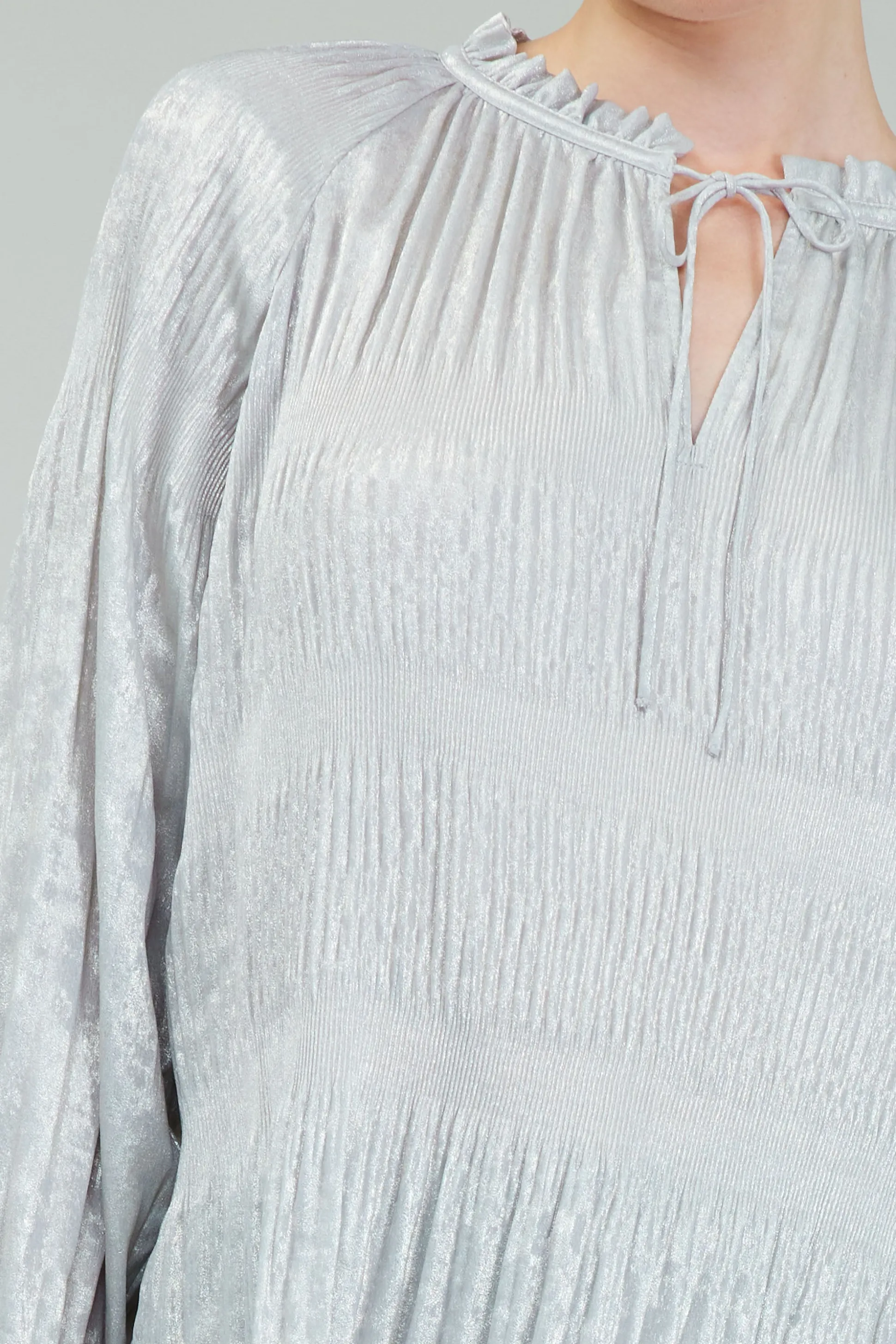 This shimmery brushed fabric blouse has delicate pleating that adds depth and dimension to the relaxed silhouette. Defined by a split neckline, it’s detailed with ruffle trim and a dainty tie.