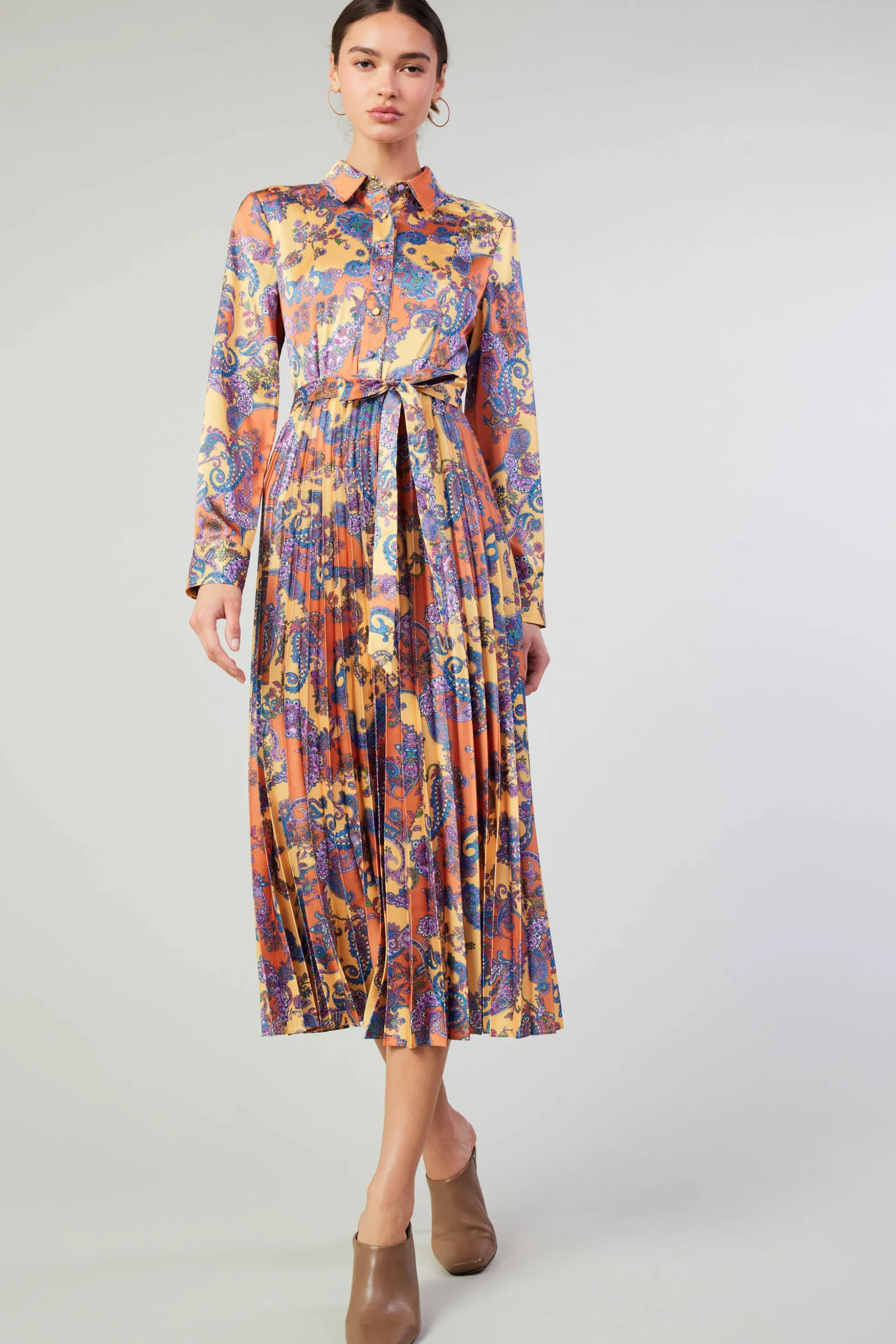 Pleated, printed, lots of personality. Inspired by a nostalgia for retro style, this paisley-patterned dress has a smart spread collar, covered buttons, and a self-tie belt that cinches the shape. Below the waist? Twirly, shin-skimming pleats that love to move.