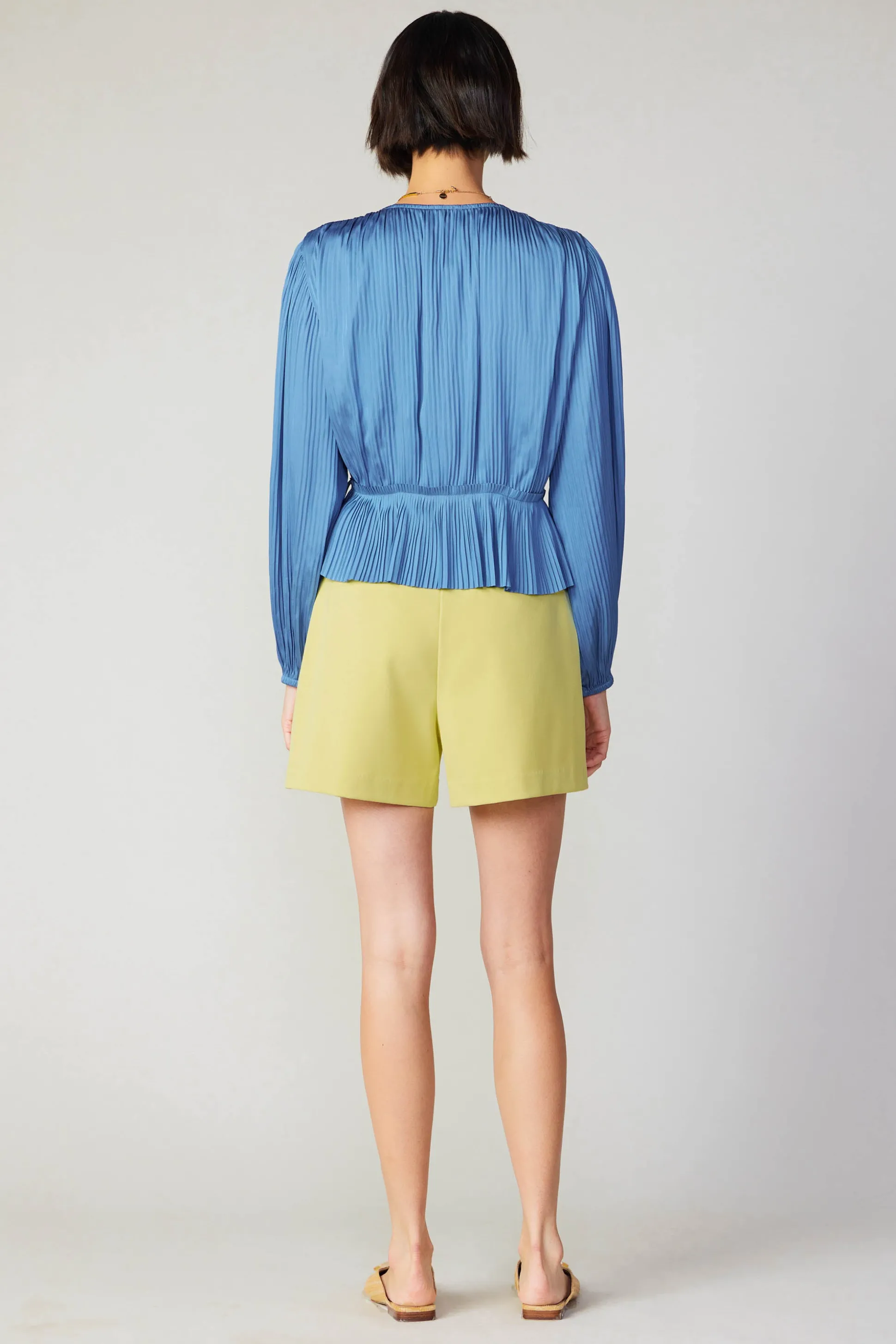 This lustrous wrap top ties at the side and has hundreds of tiny pleats that create an incredibly cool texture. It’s complete with long sleeves and a shape-enhancing peplum.
