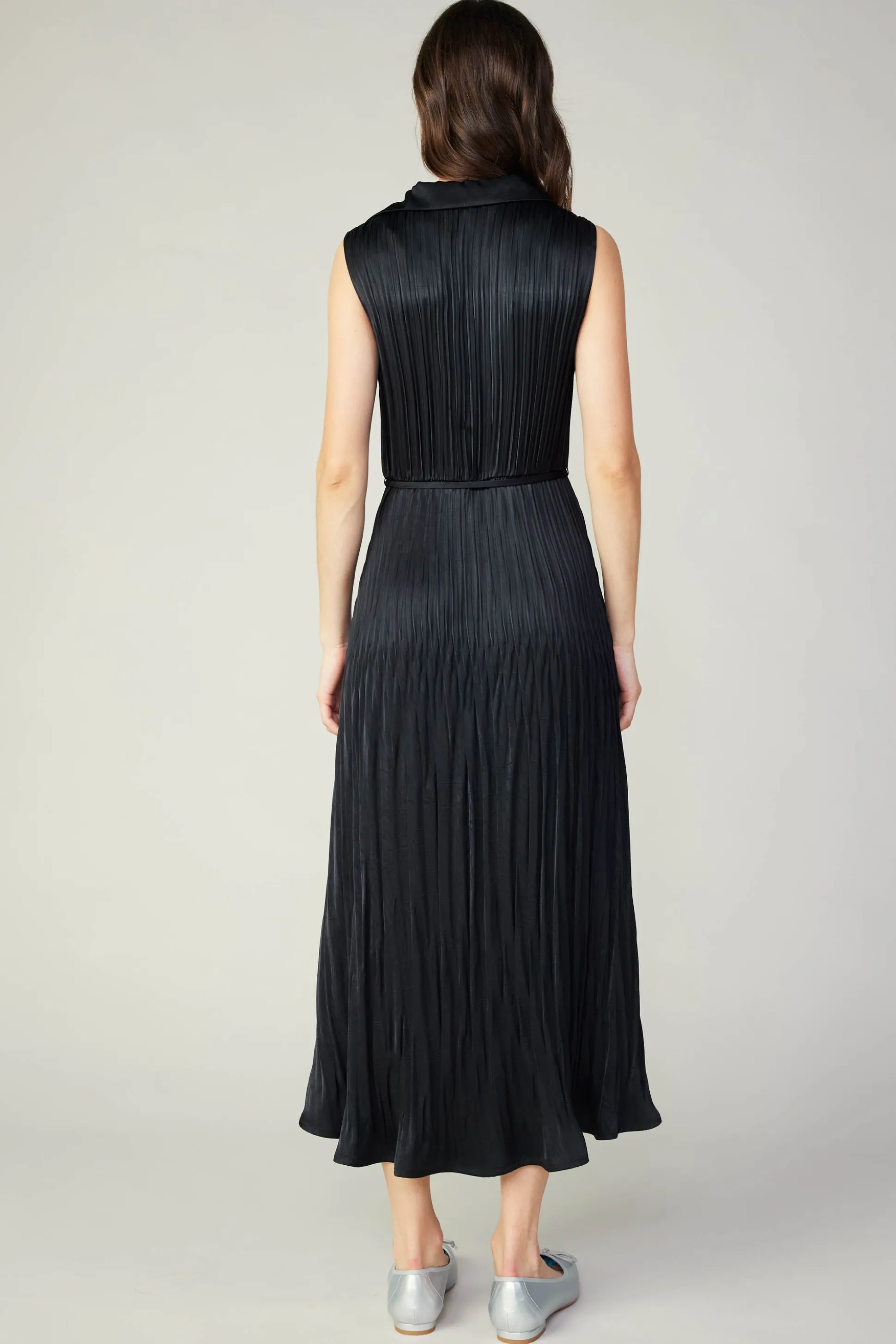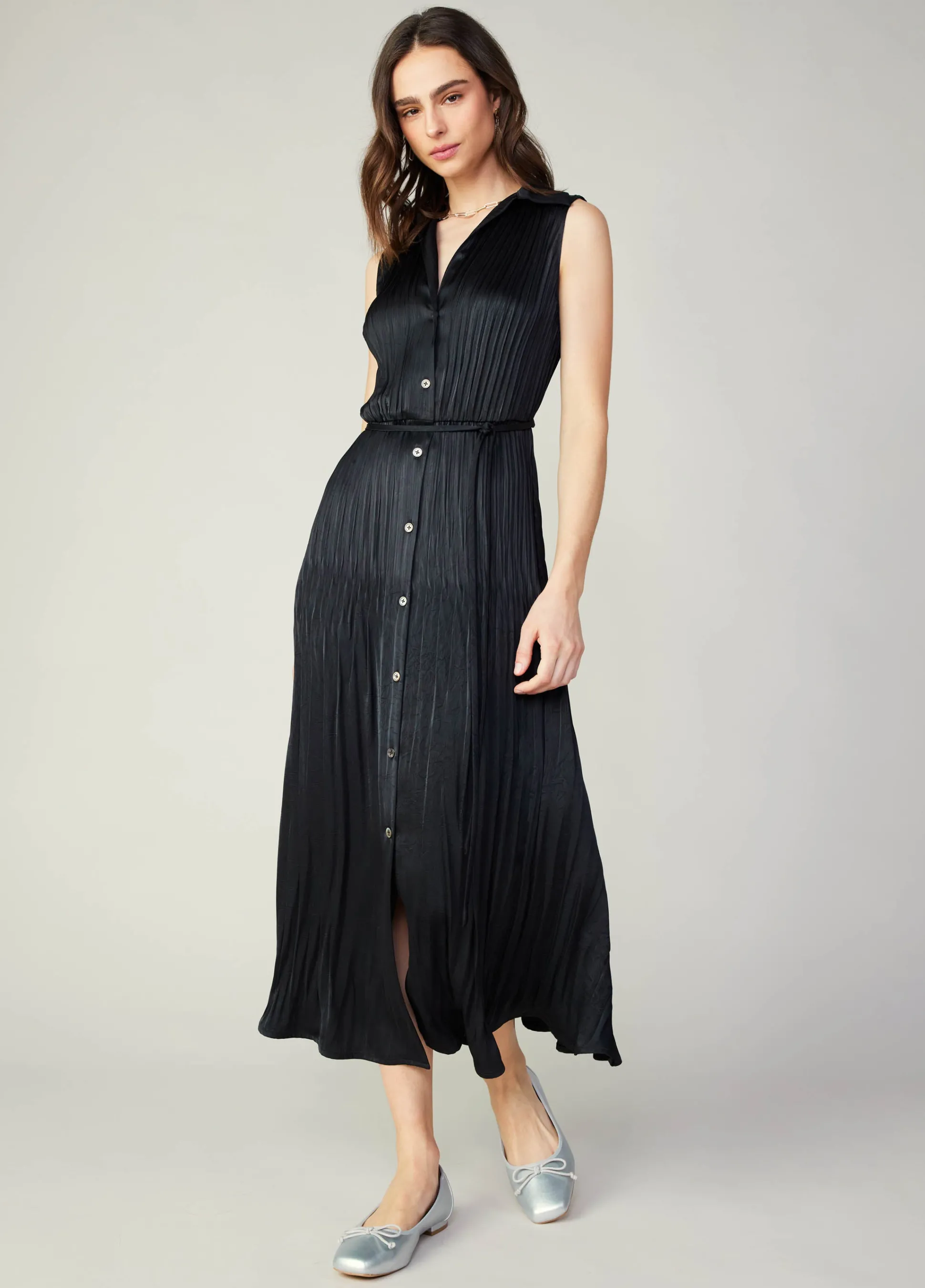 Pleat detailing lends movement and dimension to a sleeveless shirt dress. With a button placket so you can play with coverage, it’s a piece you’ll reach for again and again.