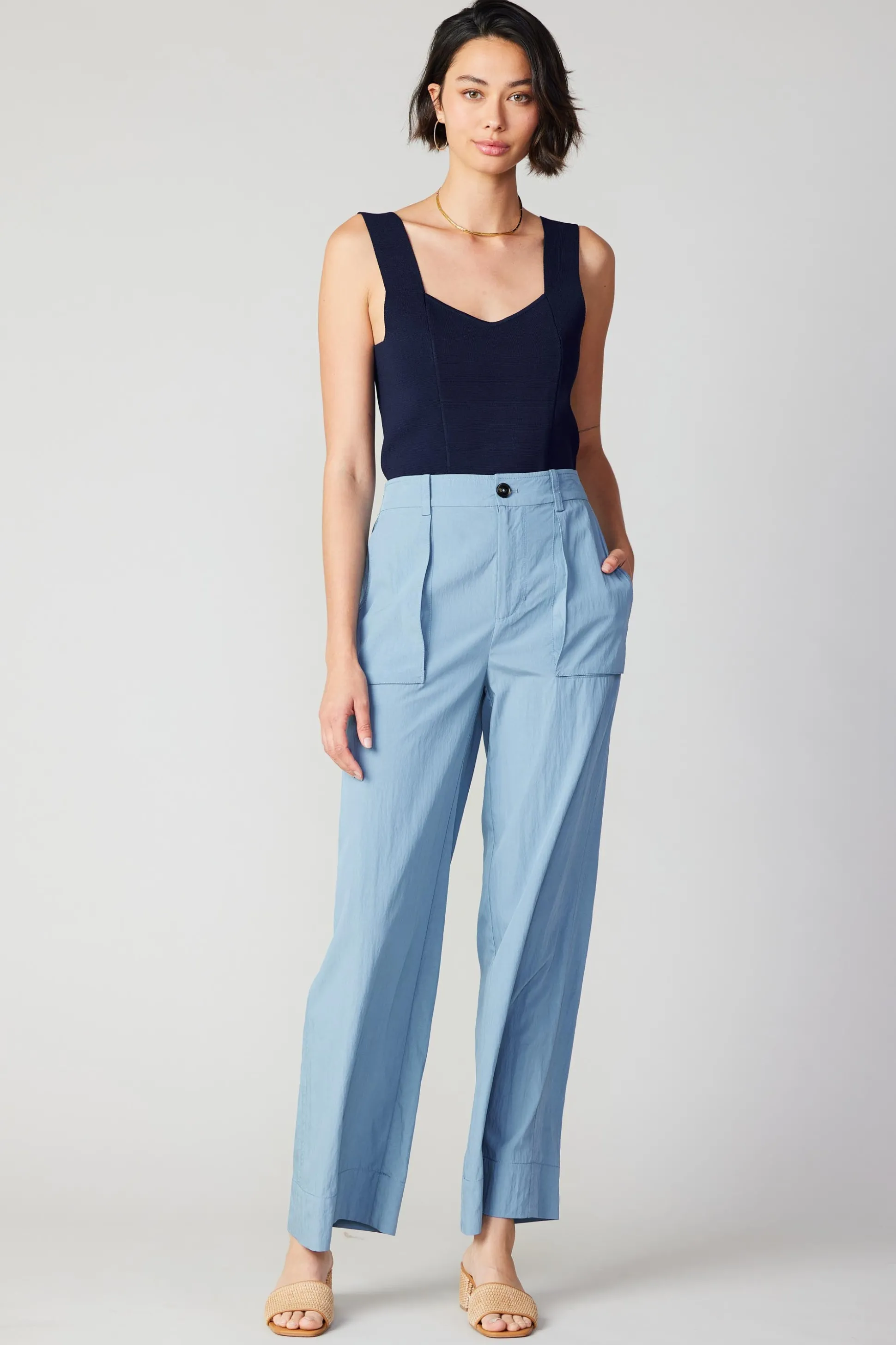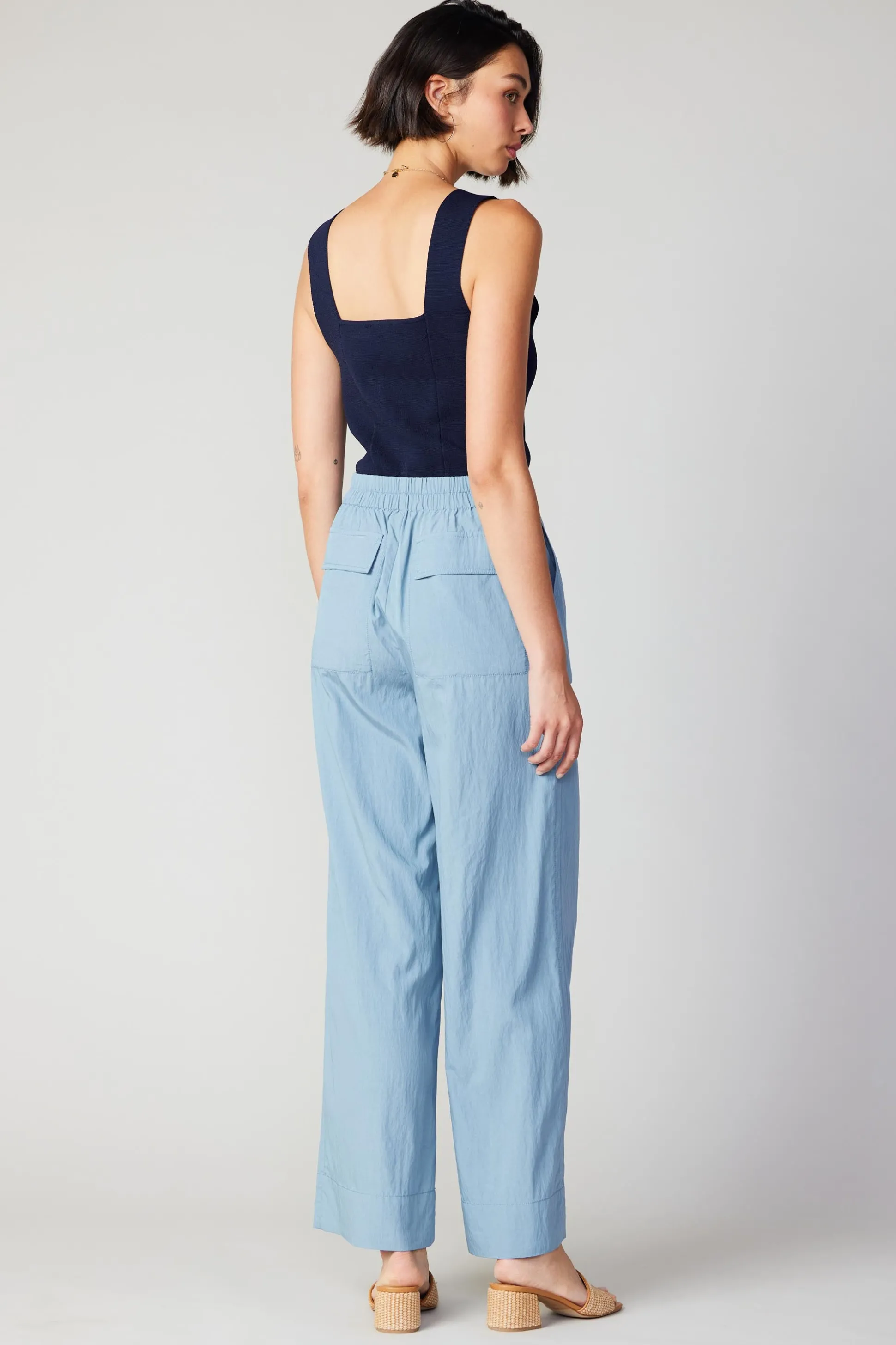 These wide-leg pants have a high-rise waist and three-dimensional utility pockets at the front. They’re lightweight with…