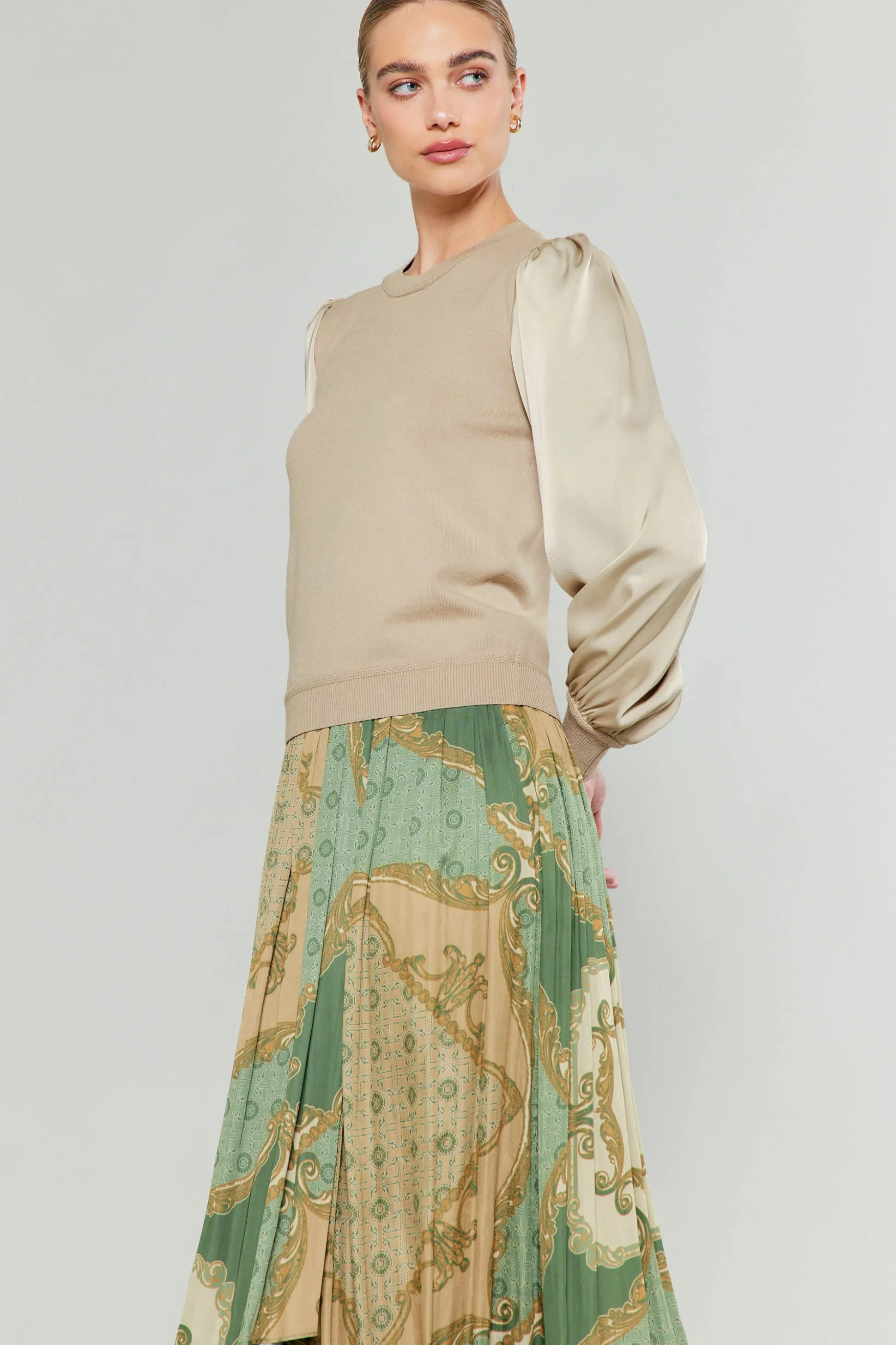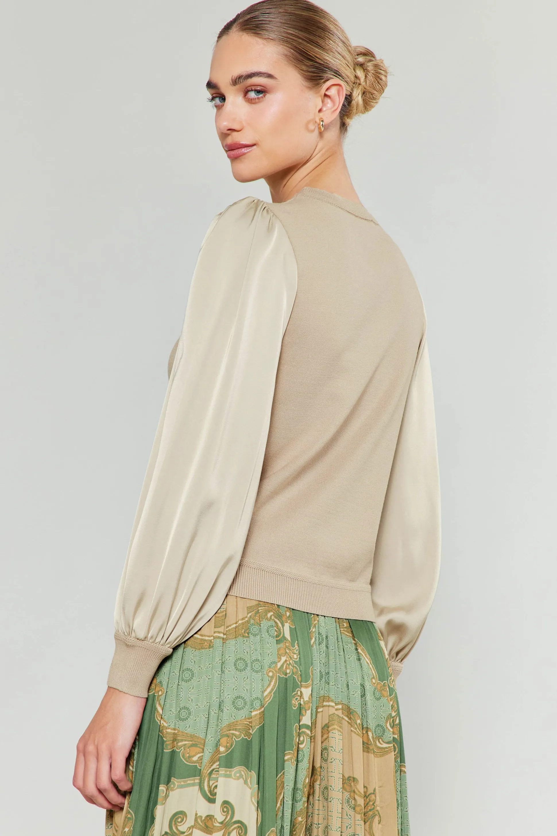 A soft-spun knit and a lustrous woven fabric combine to create a striking contrast of textures on this long-sleeve swea…