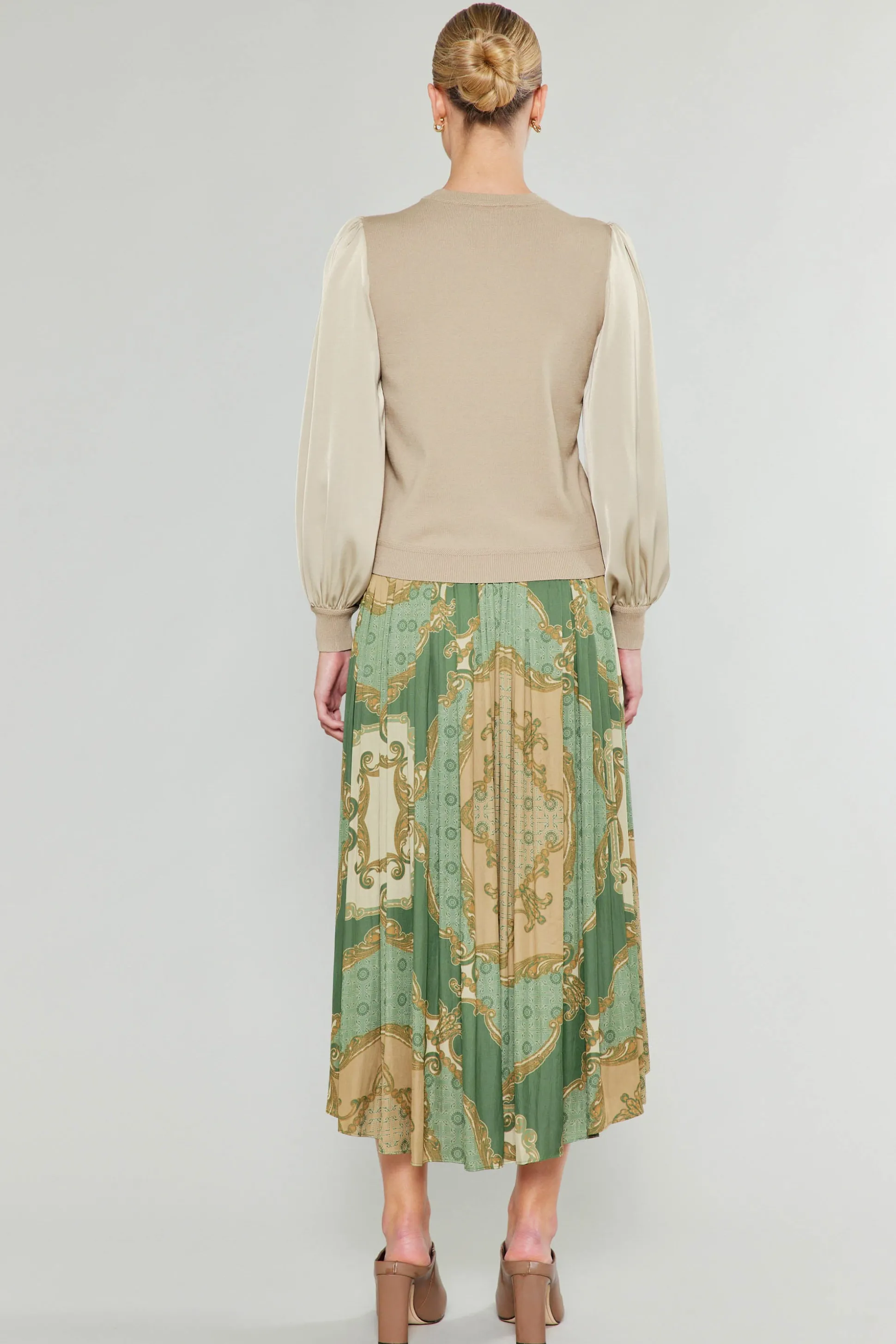 A soft-spun knit and a lustrous woven fabric combine to create a striking contrast of textures on this long-sleeve sweater. A refined addition to your cool-weather wardrobe.