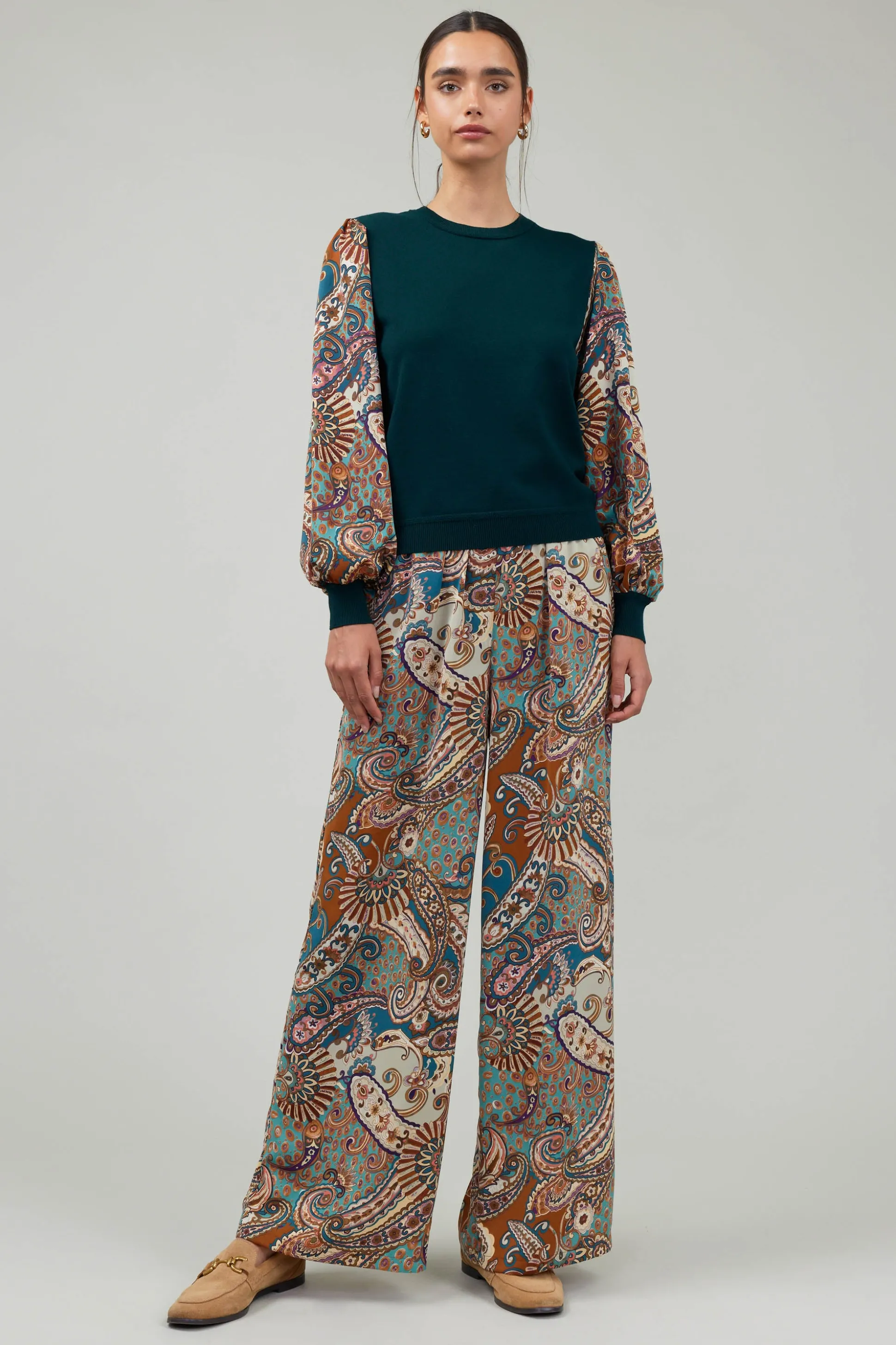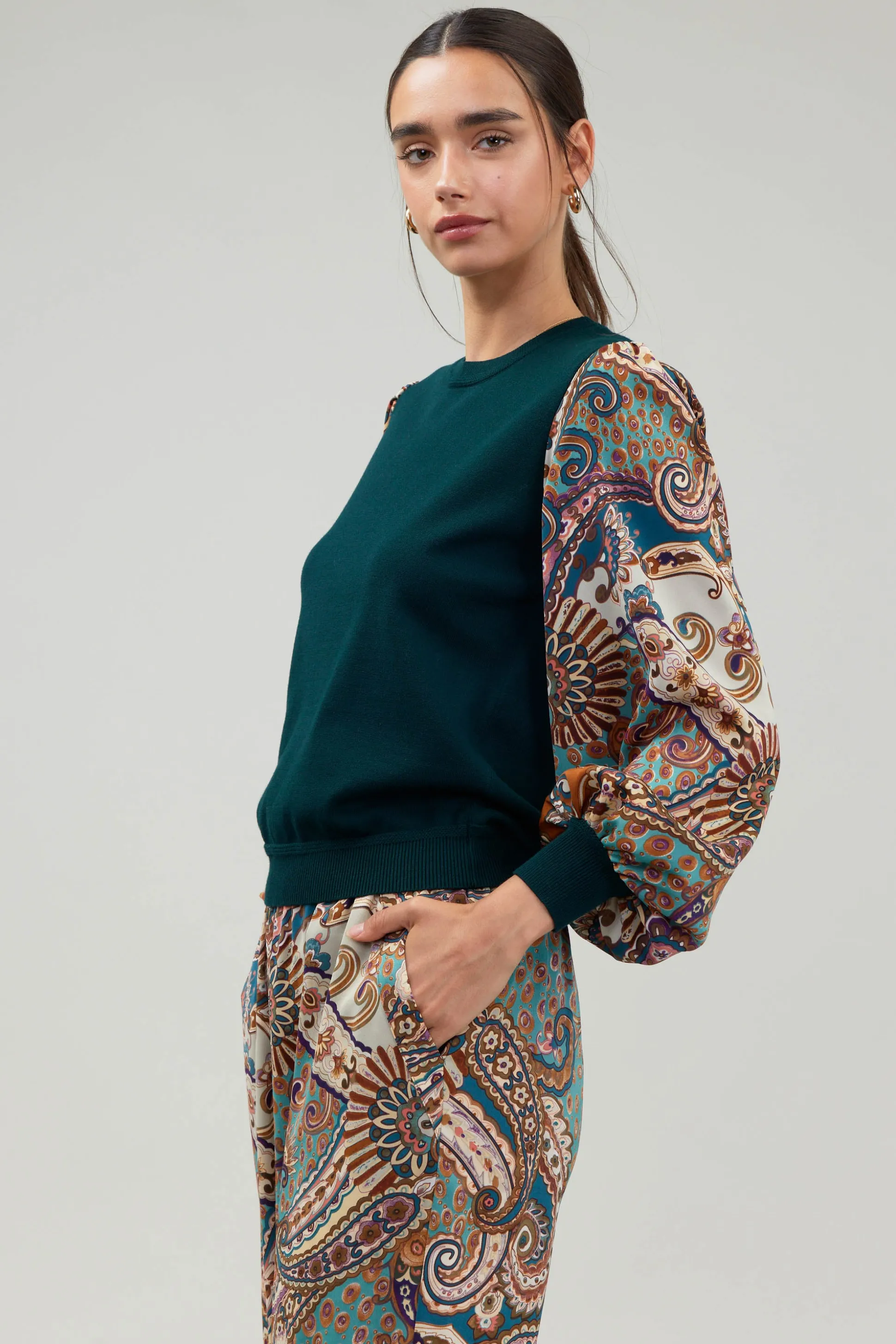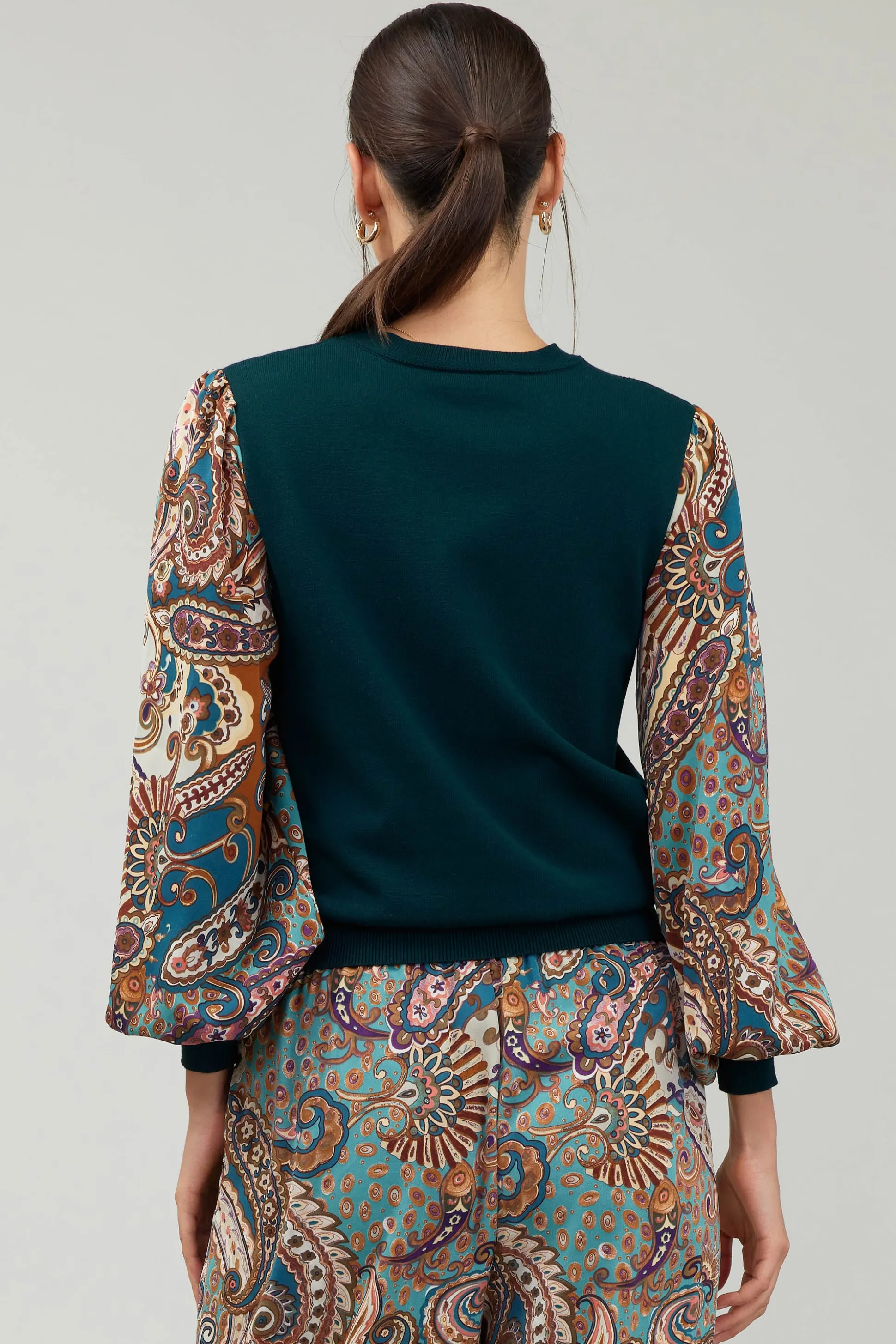 A soft-spun knit and an eccentric patterned woven fabric combines to create a striking contrast of textures on this long-sleeve sweater. A refined addition to your cool-weather wardrobe.