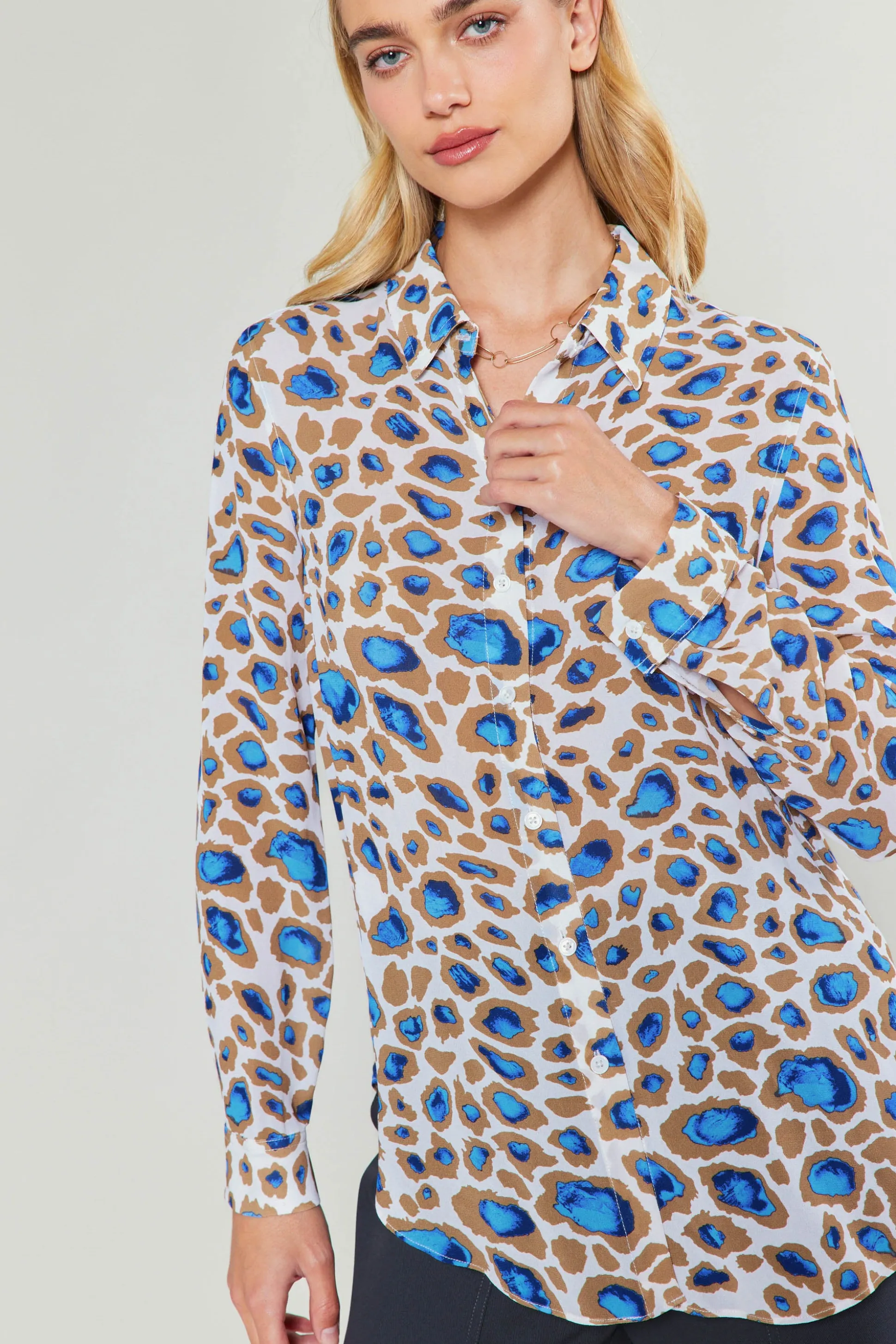 A long-sleeve buttondown shirt goes natural in a fresh take on a cenote print, blue sinkholes that dot the yucatan peninsula – It’s a statement that’s impossibleto miss.