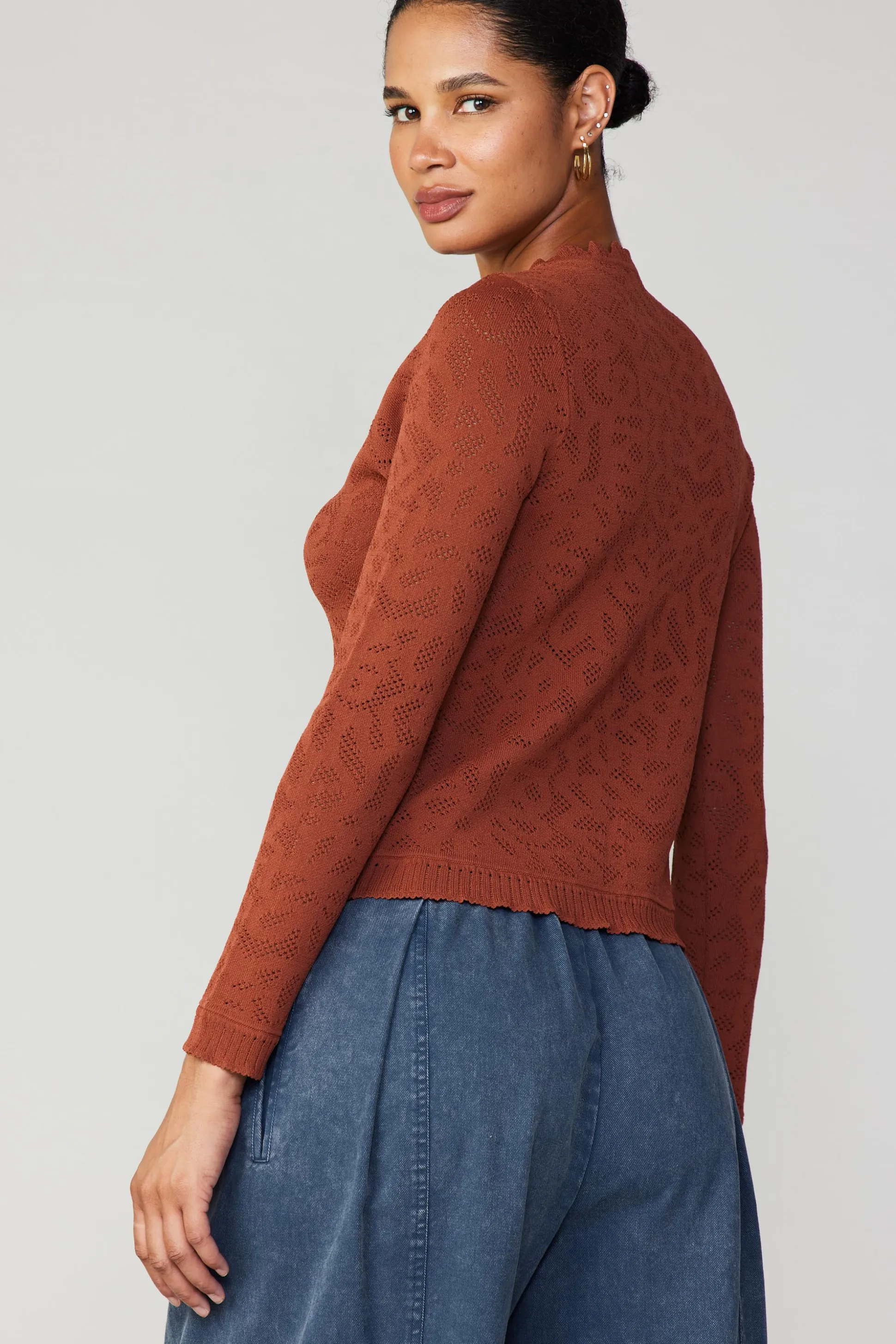 A new favorite for your knitwear collection. This long-sleeve sweater is fitted and subtly sheer in a textured knit with pointelle stitches. It’s got a scalloped neckline, plus see-through ribbed edges.