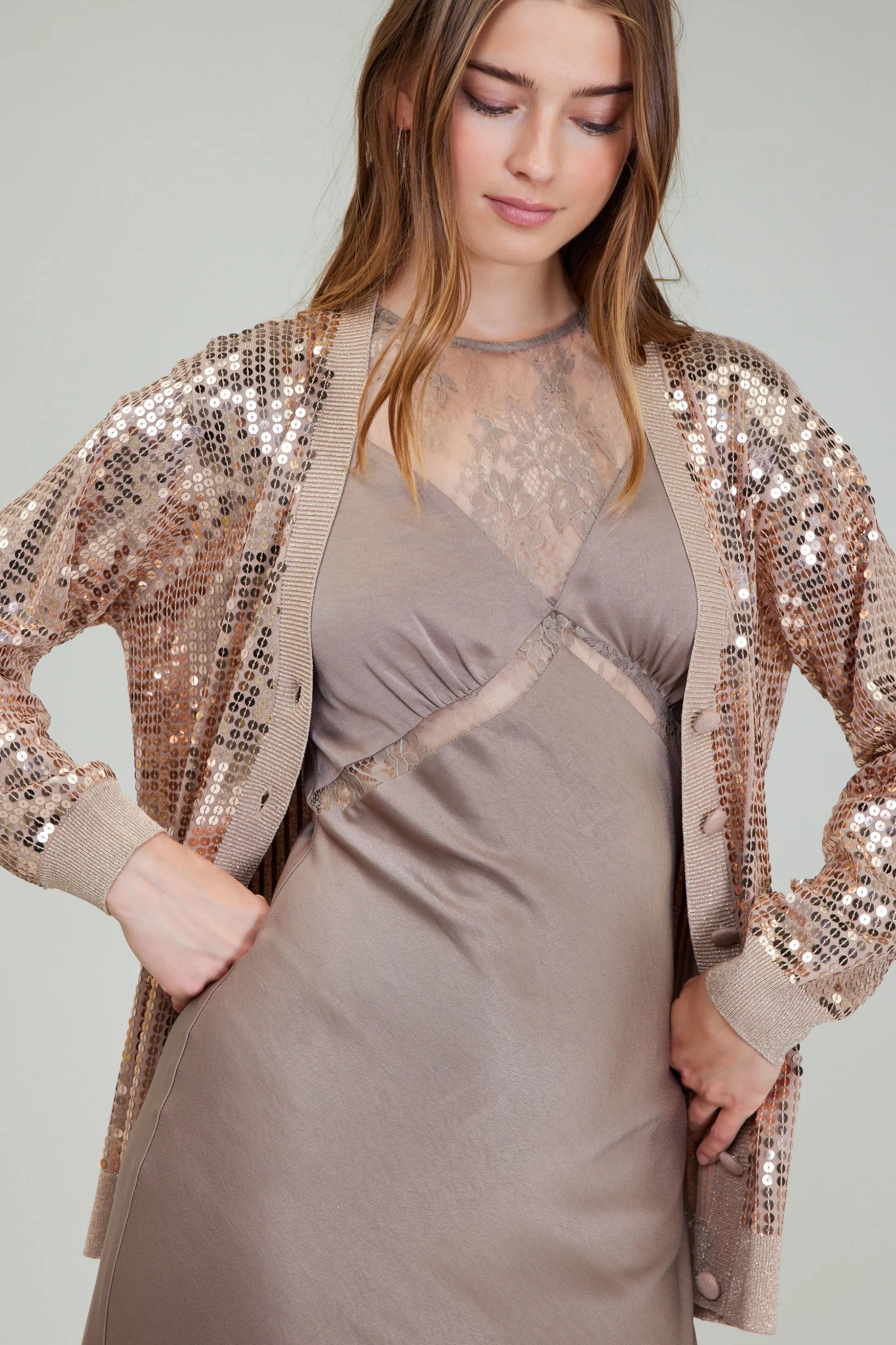 This sequined jacket makes a statement wherever it goes, scintillating with a lively pattern. Slip the long-sleeve style on and wear it loose and open, or tie it up with the matching belt.