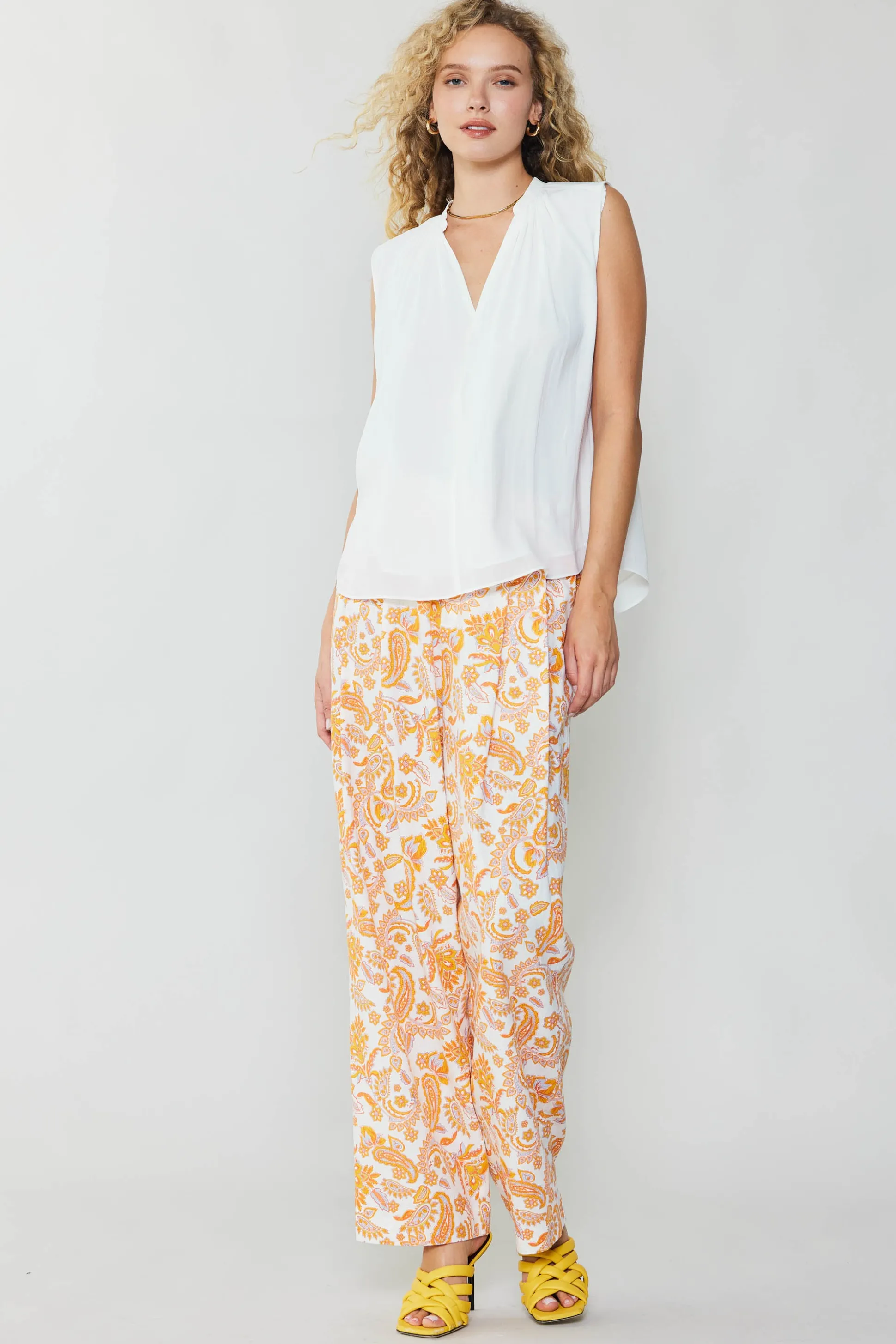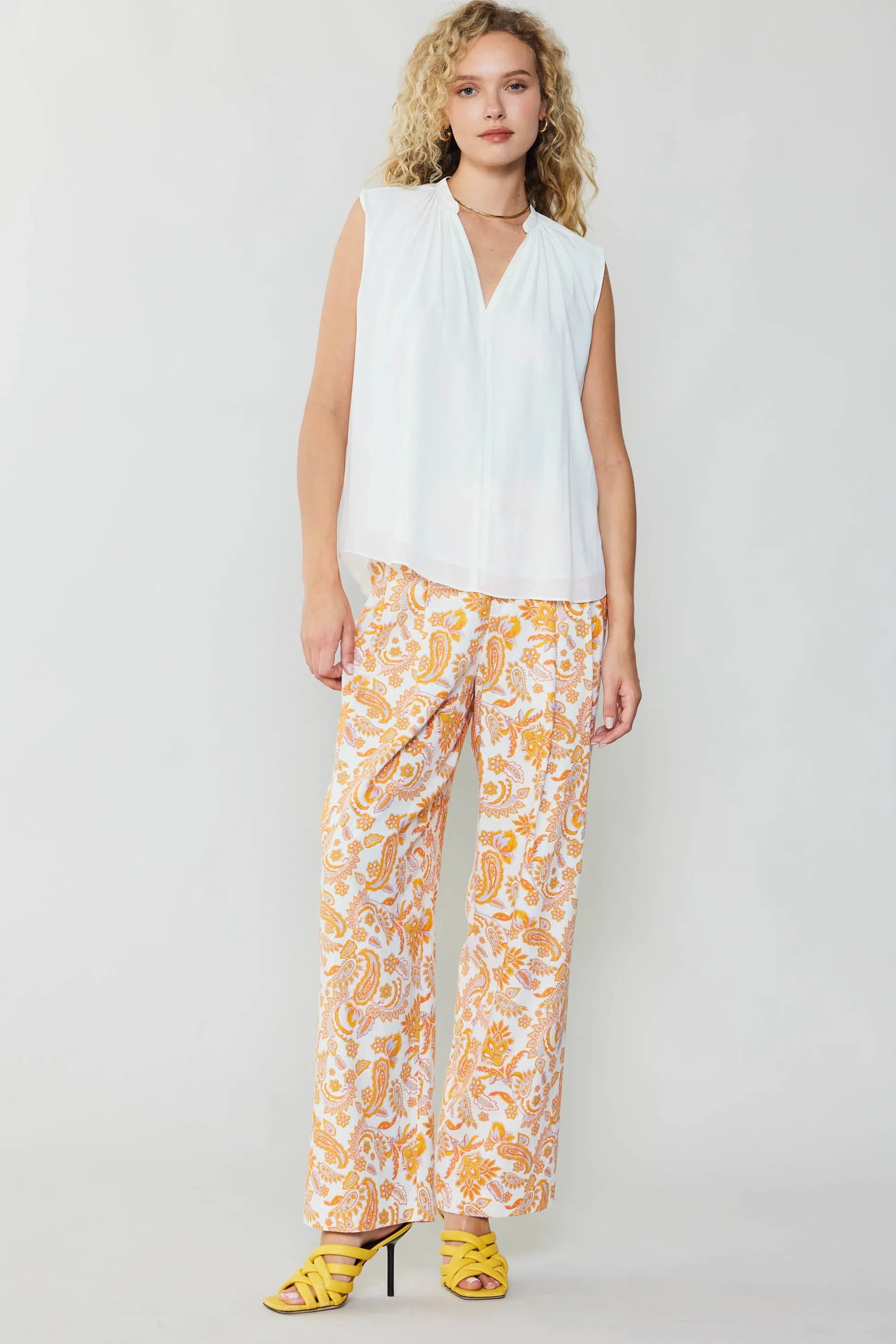 An easy, lightweight blouse for days when the temperature is climbing. The sleeveless style has a split neckline, plus gentle gathers that enhance the relaxed silhouette.