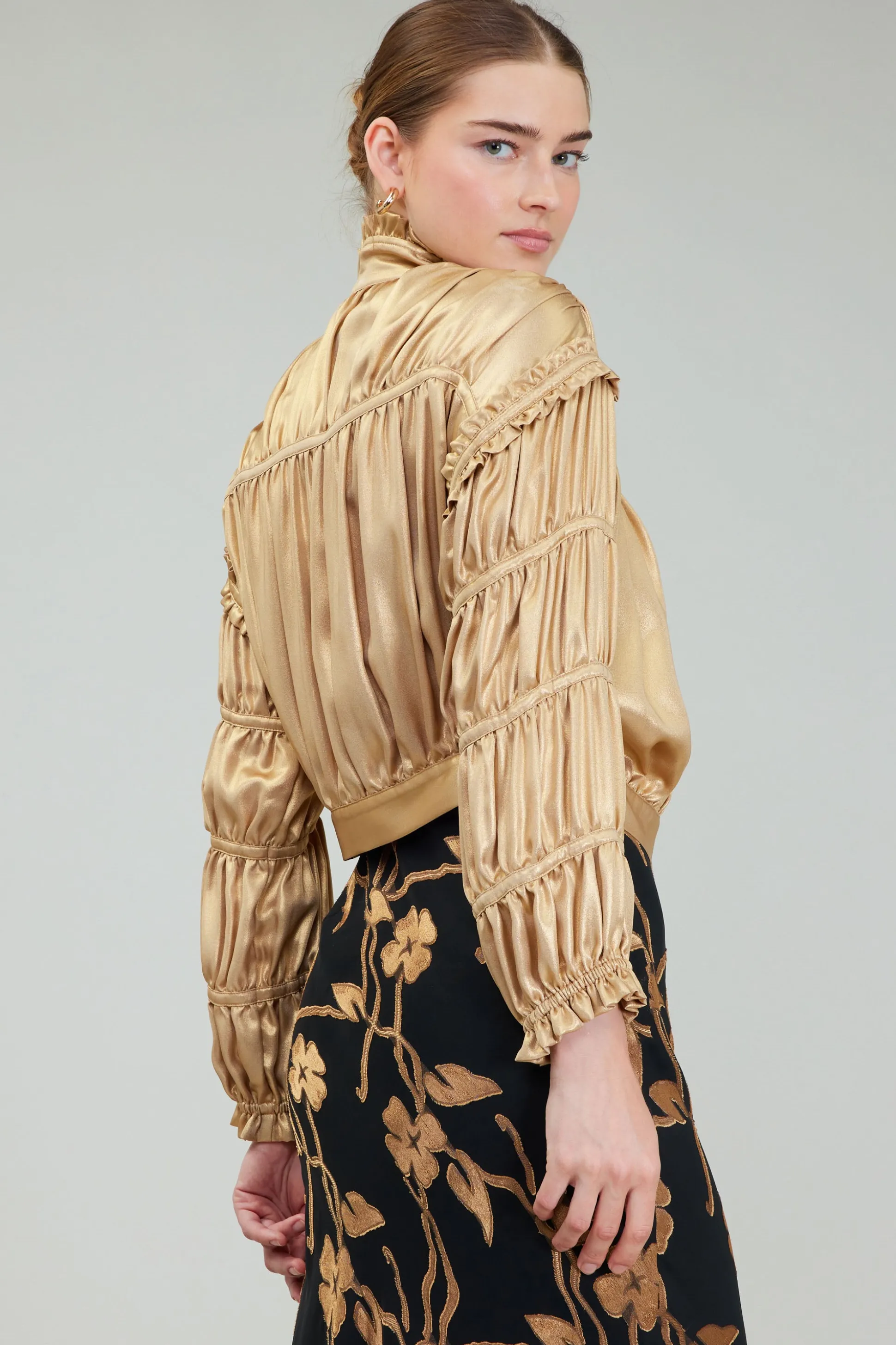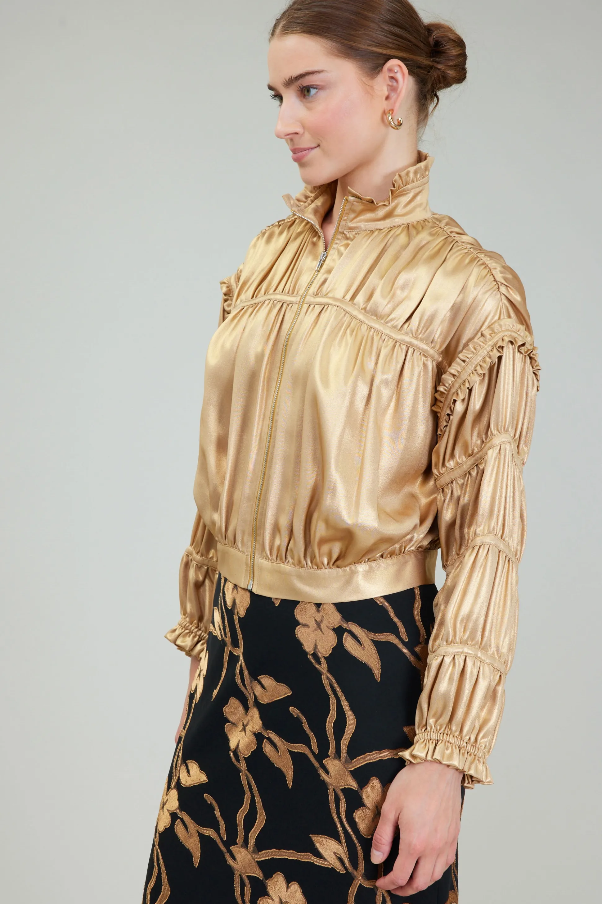 For moments that call for a statement jacket. A zip-up style with a stand collar, this lustrous layer is shirred, tiered, and finished by ruffle detailing.