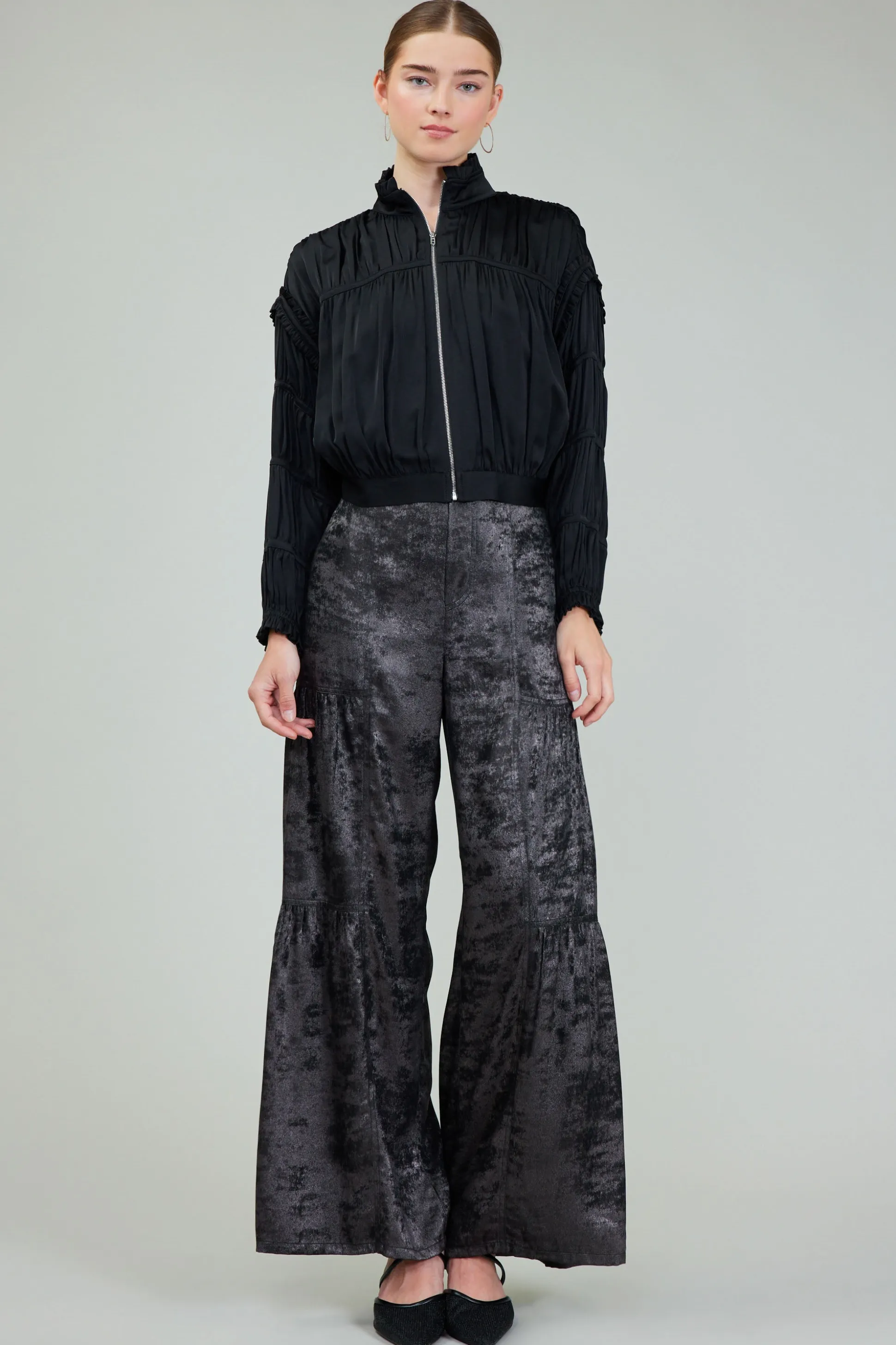 For moments that call for a statement jacket. A zip-up style with a stand collar, this lustrous layer is shirred, tiered, and finished by ruffle detailing.