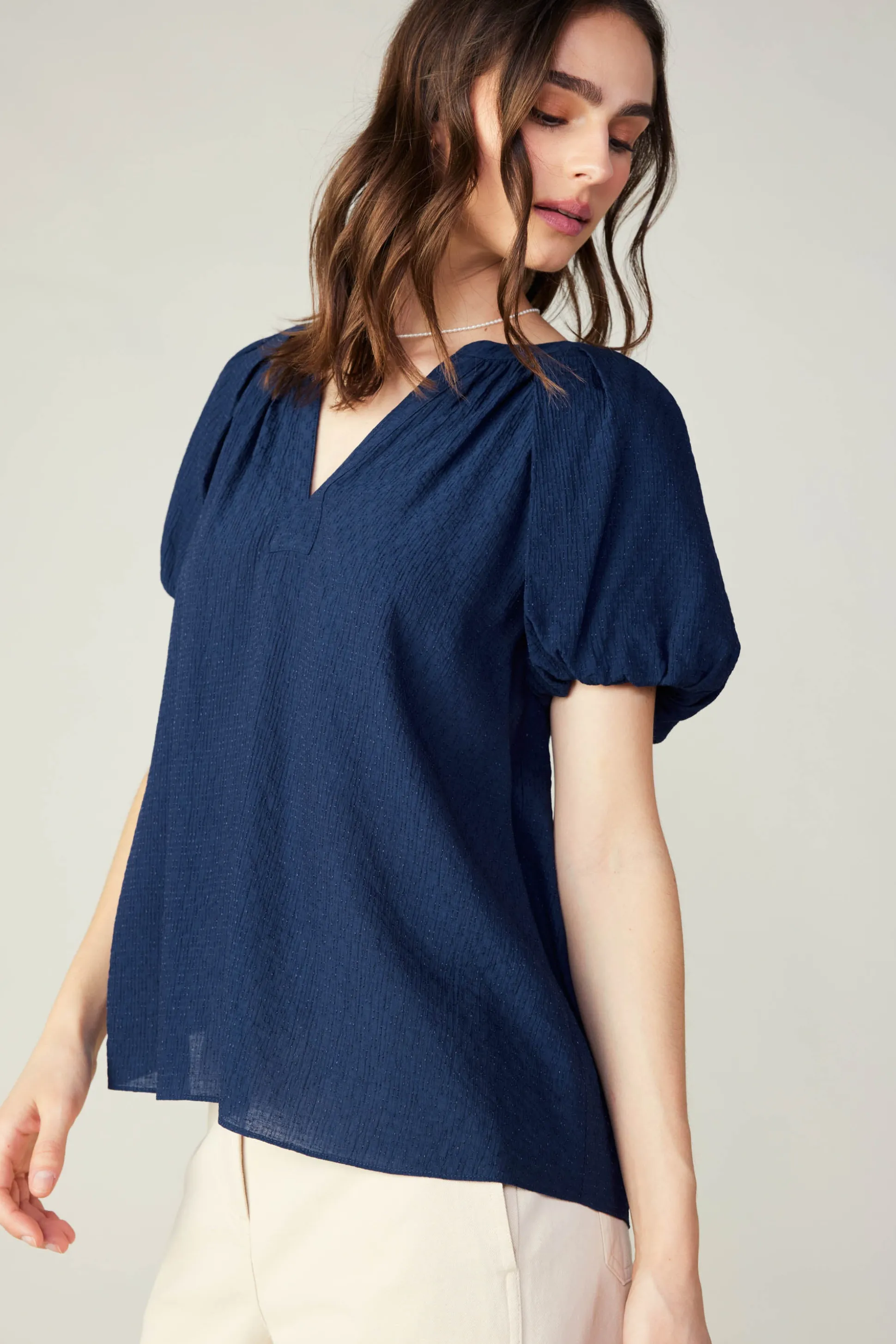 Between the split neckline and bubble sleeves, this airy blouse is effortlessly feminine. It practically floats off the body, crafted from a rayon blend fabric. Style it for work or the weekend.