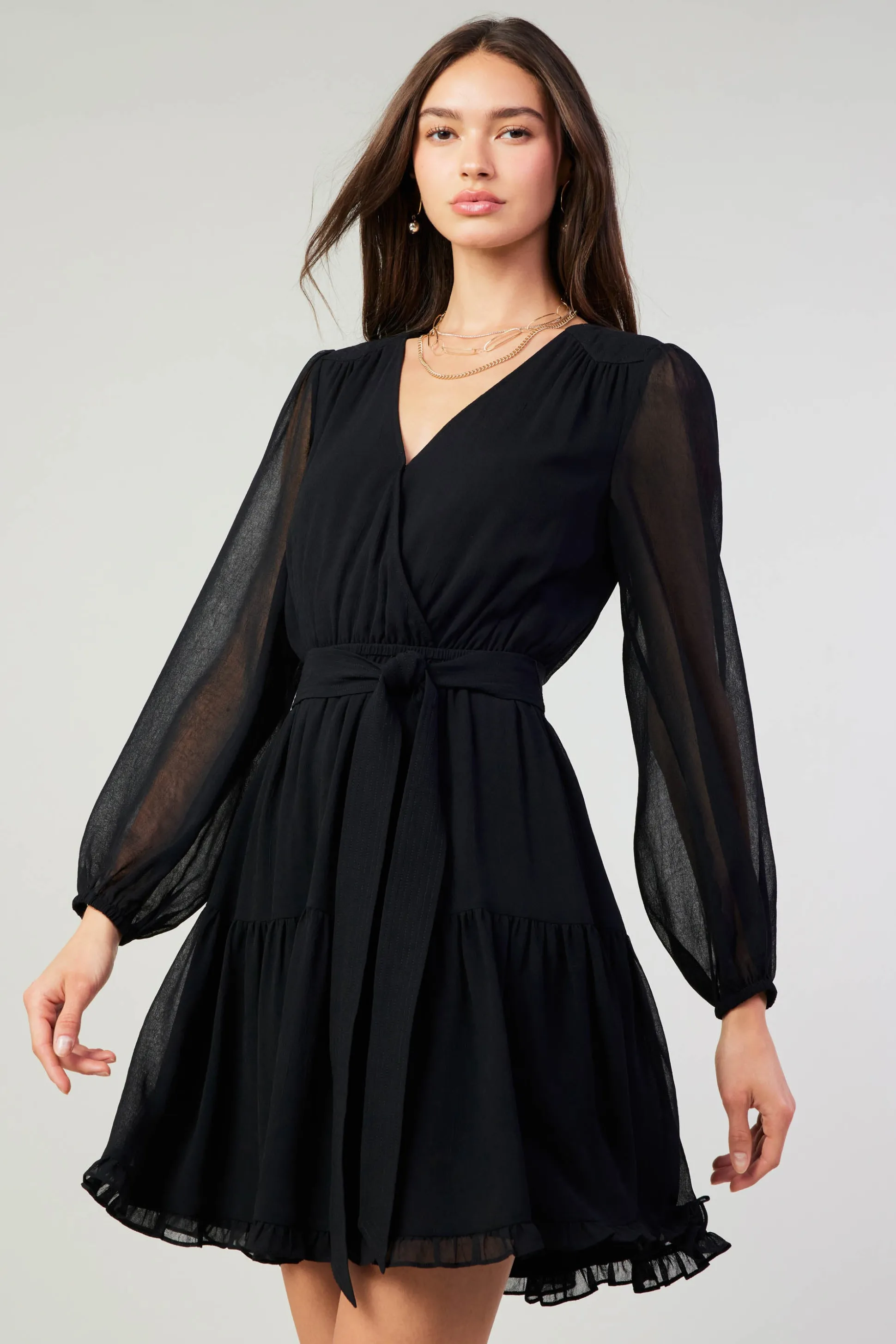 This long-sleeve mini dress has all the makings of a favorite. It flatters with a surplice-style bodice and cinches in at the waist with a belt before falling to a swingy hem. Hits of ruffles finish the look with a sweet touch.