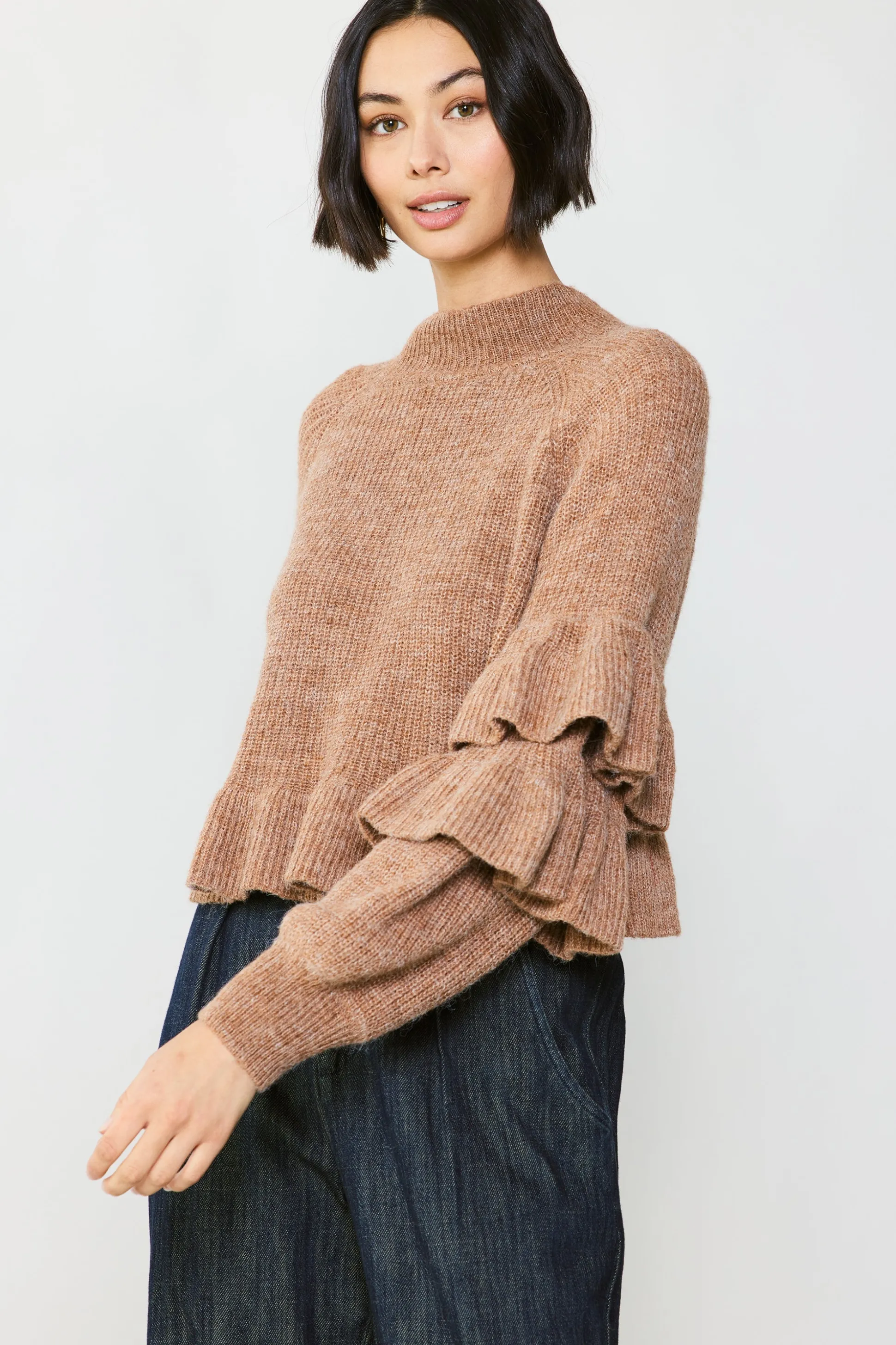 This striped sweater with ruffled sleeves will be the standout of your knitwear collection. The mockneck style has a relaxed, slightly boxy silhouette finished by a ruffled hem.