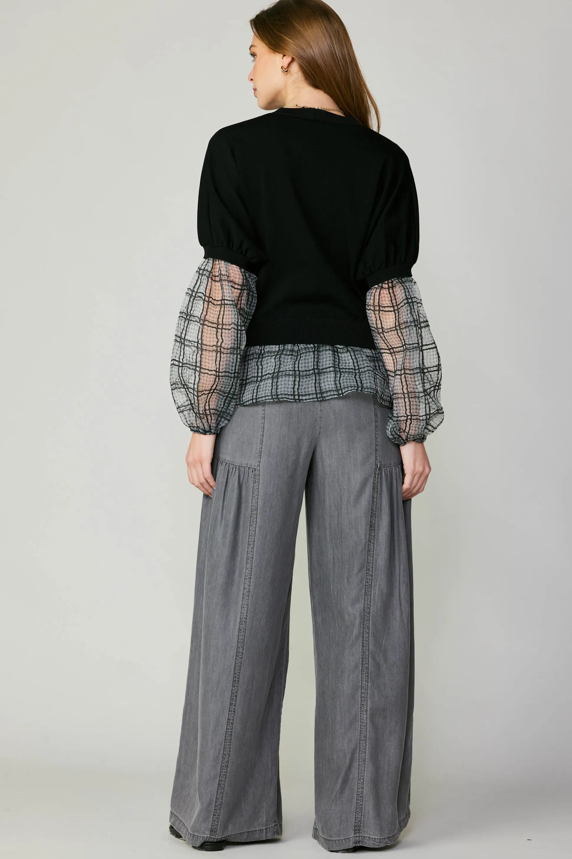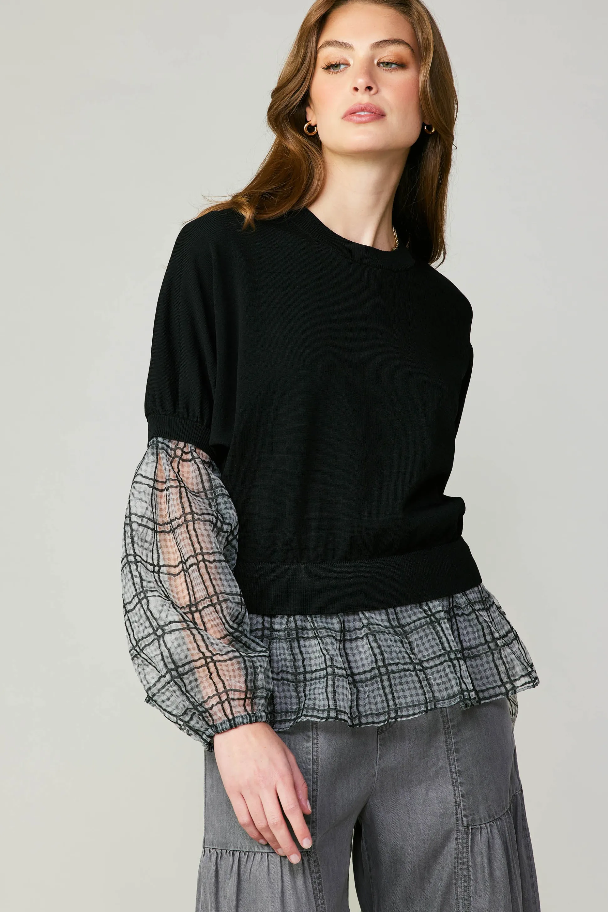 Turn up the drama in this statement-making sweater top in mixed-media design. It’s got a layered look with sheer, woven windowpane plaid billowing out at the sleeves and hem.